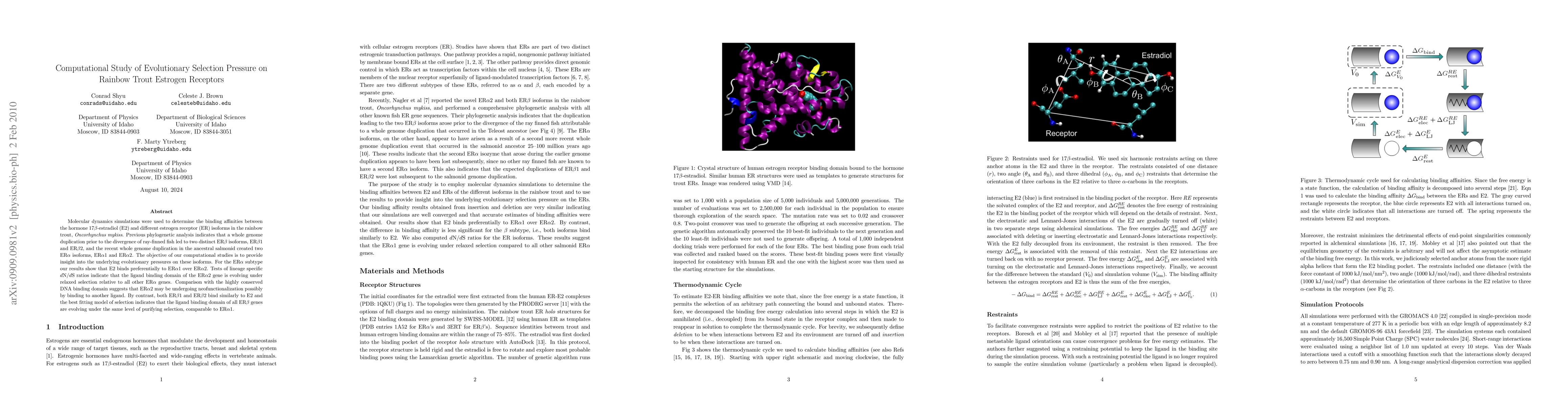 Molecular dynamics simulations were used to determine the binding affinities between between the hormone 17 beta-estradiol (E2) and different estrogen receptor (ER) isoforms in the rainbow trout, Oncorhynchus mykiss. Previous phylogenetic analysis indicates that a whole genome duplication prior to the divergence of ray-finned fish led to two distinct ER beta isoforms, ER beta 1 and ER beta 2, and the recent whole genome duplication in the ancestral salmonid created two ER alpha isoforms, ER alpha 1 and ER alpha 2. The objective of our computational studies is to provide insight into the underlying evolutionary pressures on these isoforms. For the ER alpha subtype our results show that E2 binds preferentially to ER alpha 1 over ER alpha 2. Tests of lineage specific dN/dS ratios indicate that the ligand binding domain of the ER alpha 2 gene is evolving under relaxed selection relative to all other ER alpha genes. Comparison with the highly conserved DNA binding domain suggests that ER alpha 2 may be undergoing neofunctionalization possibly by binding to another ligand. By contrast, both ER beta 1 and ER beta 2 bind similarly to E2 and the best fitting model of selection indicates that the ligand binding domain of all ER beta genes are evolving under the same level of purifying selection, comparable to ER alpha 1.