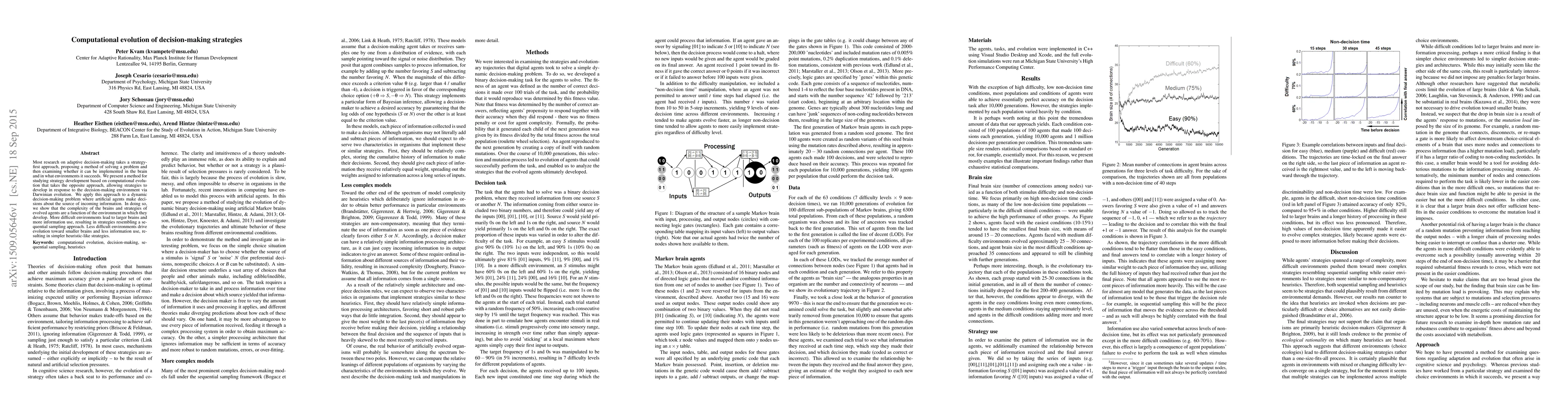 This paper proposes a computational evolution method to study adaptive decision-making strategies, demonstrating that the complexity of evolved agents' brains and strategies is contingent on their decision-making environment. More challenging environments lead to larger brains and complex sampling strategies, while simpler environments favor smaller brains and heuristic-based approaches.