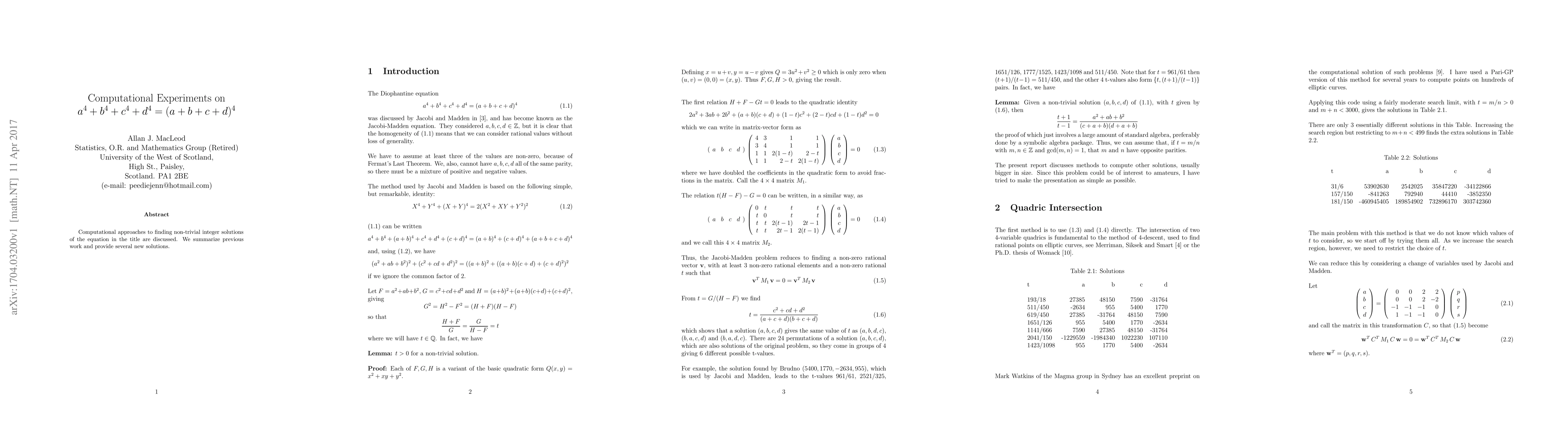 Computational approaches to finding non-trivial integer solutions of the equation in the title are discussed. We summarize previous work and provide several new solutions.