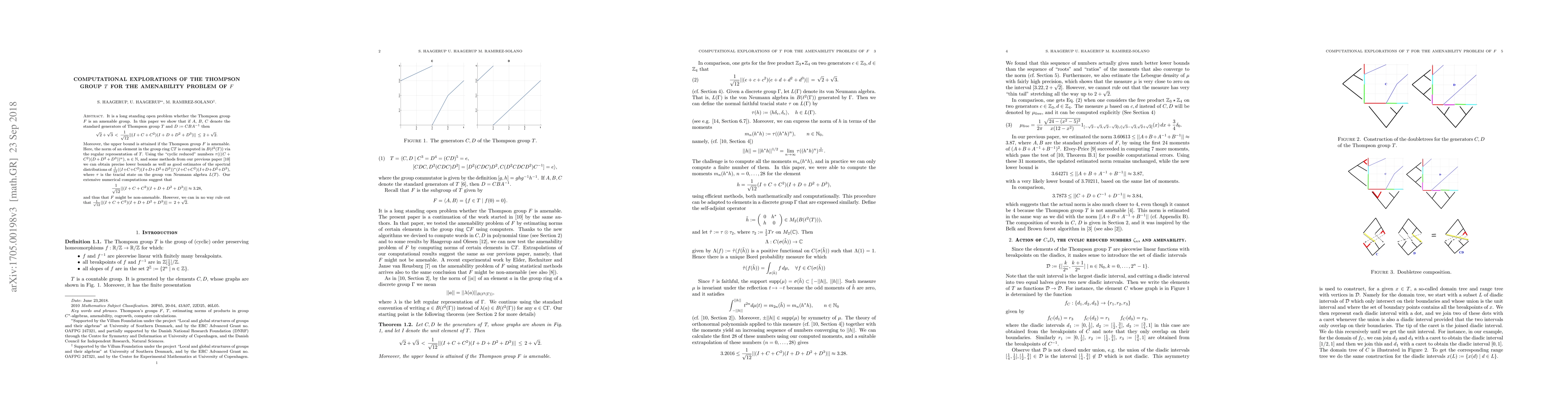 It is a long standing open problem whether the Thompson group $F$ is an amenable group. In this paper we show that if $A$, $B$, $C$ denote the standard generators of Thompson group $T$ and $D:=C B A^{-1}$ then $$\sqrt2+\sqrt3\,<\,\frac1{\sqrt{12}}||(I+C+C^2)(I+D+D^2+D^3)||\,\le\, 2+\sqrt2.$$ Moreover, the upper bound is attained if the Thompson group $F$ is amenable. Here, the norm of an element in the group ring $\mathbb{C} T$ is computed in $B(\ell^2(T))$ via the regular representation of $T$. Using the "cyclic reduced" numbers $\tau(((C+C^2)(D+D^2+D^3))^n)$, $n\in\mathbb{N}$, and some methods from our previous paper [arXiv:1409.1486] we can obtain precise lower bounds as well as good estimates of the spectral distributions of $\frac1{12}((I+C+C^2)(I+D+D^2+D^3))^*(I+C+C^2)(I+D+D^2+D^3),$ where $\tau$ is the tracial state on the group von Neumann algebra $L(T)$. Our extensive numerical computations suggest that $$\frac1{\sqrt{12}}||(I+C+C^2)(I+D+D^2+D^3)||\approx 3.28,$$ and thus that $F$ might be non-amenable. However, we can in no way rule out that $\frac1{\sqrt{12}}||(I+C+C^2)(I+D+D^2+D^3)||=\, 2+\sqrt2$.