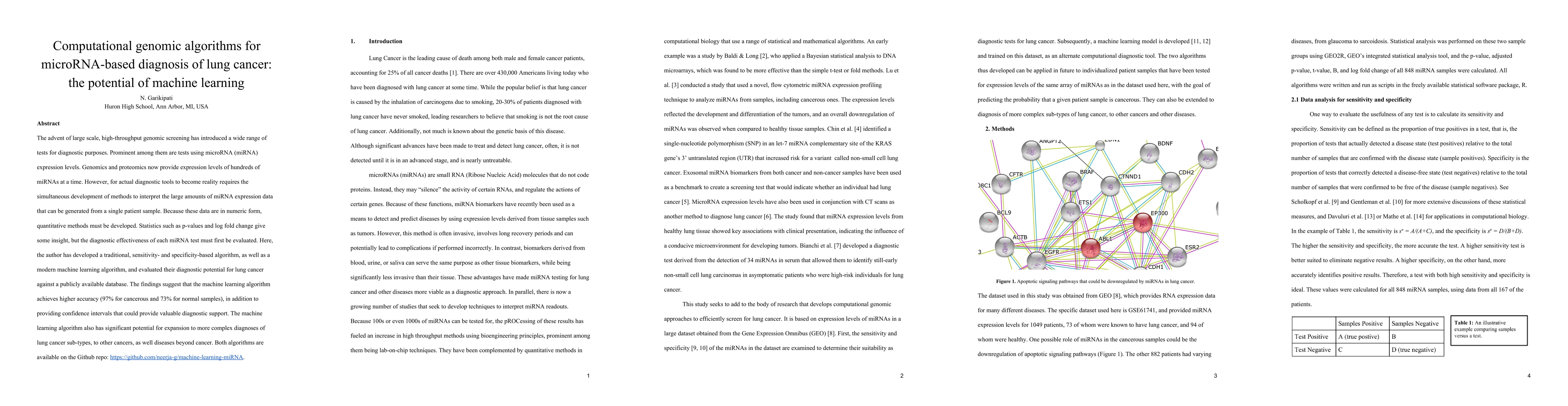 This paper develops computational genomic algorithms, including a traditional and a machine learning approach, to diagnose lung cancer using miRNA expression data. The machine learning algorithm shows superior diagnostic accuracy (97% for cancerous, 73% for normal samples) and potential for broader application to various cancers and diseases.