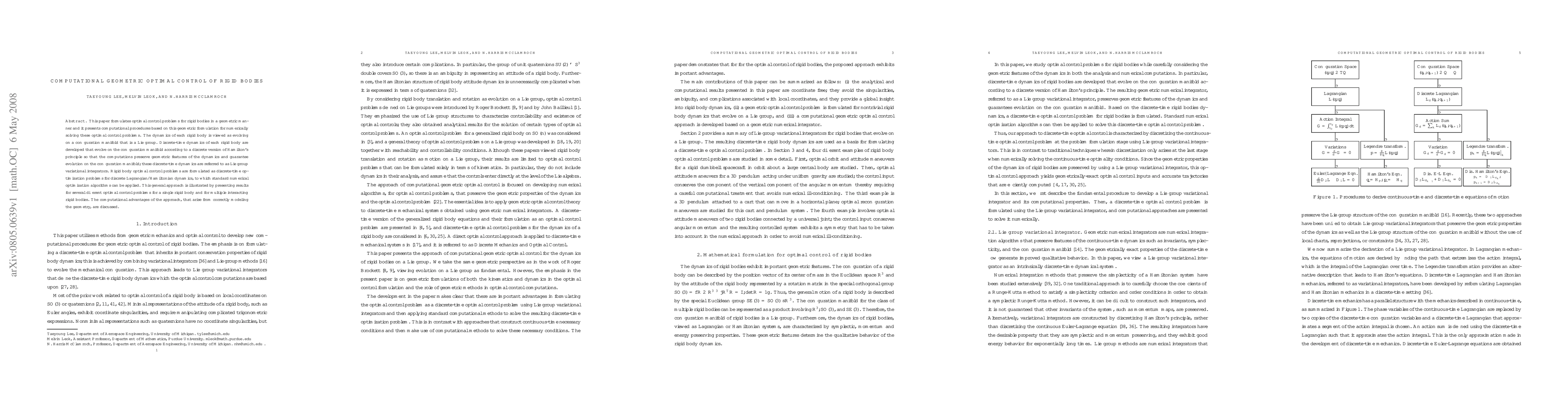 This paper presents a geometric approach to optimal control of rigid bodies, formulating problems on a configuration manifold as Lie group variational integrators. It demonstrates computational benefits from preserving geometric features and applies standard optimization algorithms to solve these problems for both single and multiple rigid bodies.