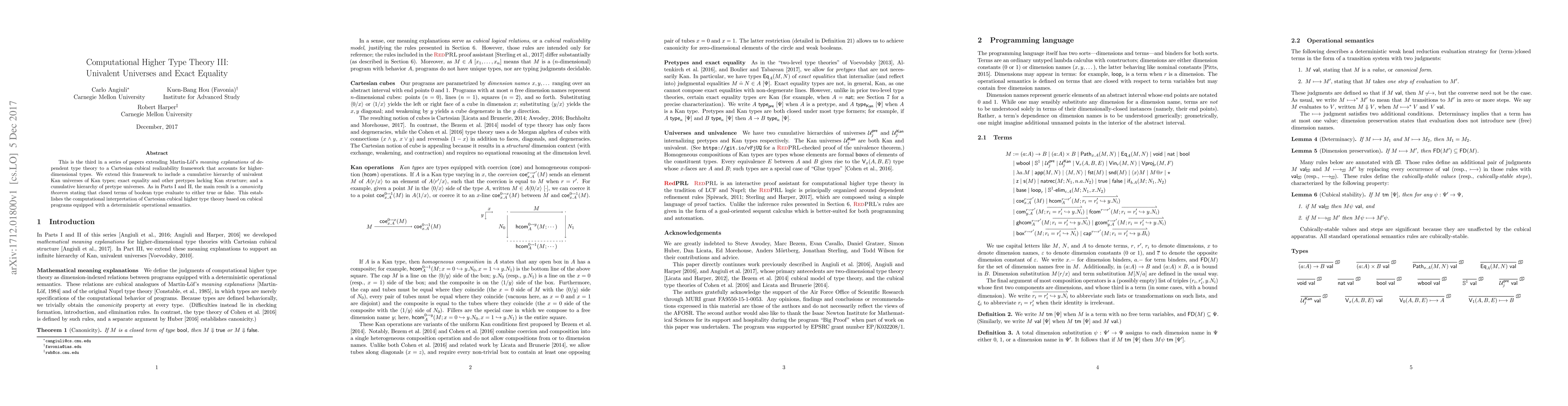 This paper extends Martin-Löf's dependent type theory into a cubical framework, introducing a hierarchy of univalent Kan universes and establishing computational interpretations for higher types. The main result is a canonicity theorem ensuring boolean terms evaluate deterministically, underpinning the operational semantics of cubical programs.