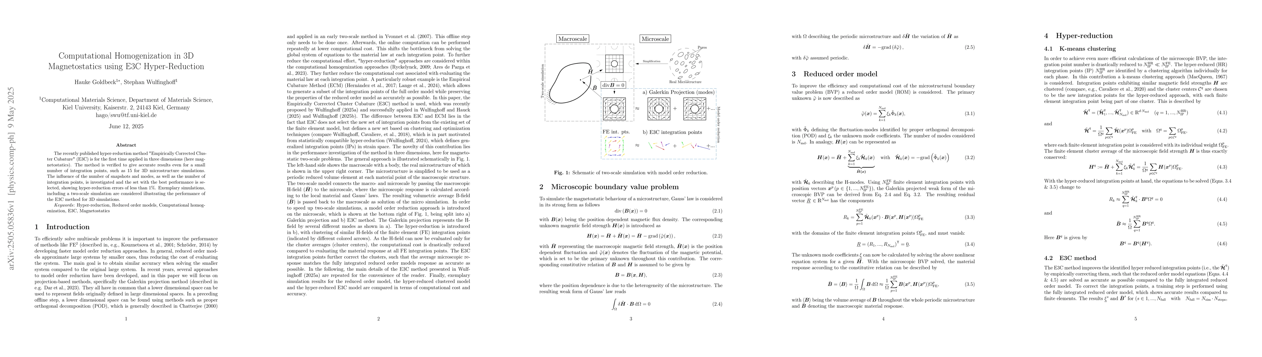 The research applies the 'Empirically Corrected Cluster Cubature' (E3C) hyper-reduction method in 3D magnetostatics for computational homogenization, validating its accuracy with as few as 15 integration points.