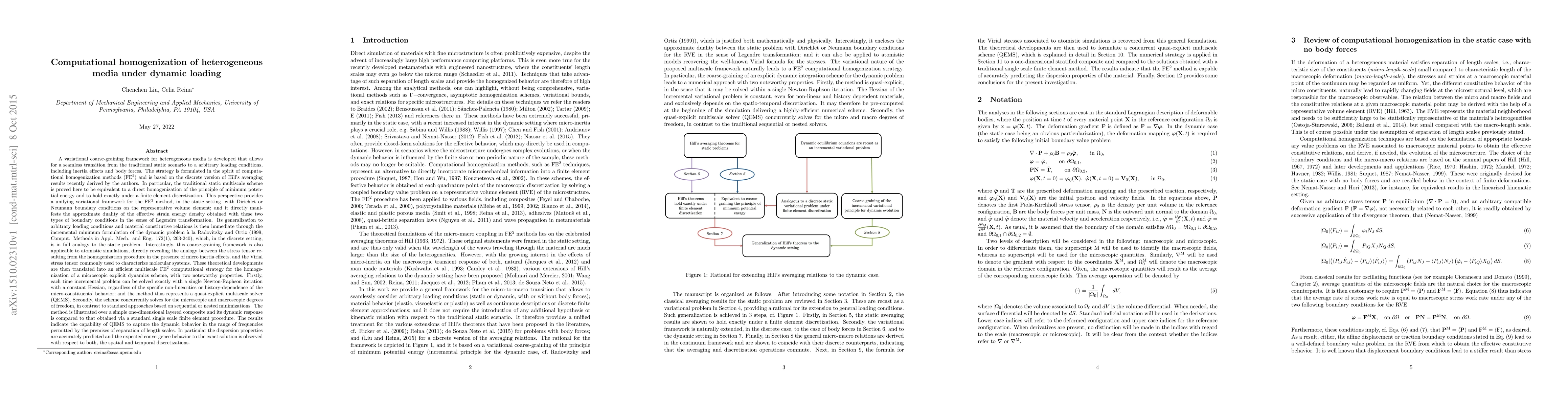 A variational coarse-graining framework for heterogeneous media is developed that allows for a seamless transition from the traditional static scenario to a arbitrary loading conditions, including inertia effects and body forces. The strategy is formulated in the spirit of computational homogenization methods (FE$^2$) and is based on the discrete version of Hill's averaging results recently derived by the authors. In particular, the traditional static multiscale scheme is proved here to be equivalent to a direct homogenization of the principle of minimum potential energy and to hold exactly under a finite element discretization. This perspective provides a unifying variational framework for the FE$^2$ method, in the static setting, with Dirichlet or Neumann boundary conditions on the representative volume element; and it directly manifests the approximate duality of the effective strain energy density obtained with these two types of boundary conditions in the sense of Legendre transformation. Its generalization to arbitrary loading conditions and material constitutive relations is then immediate through the incremental minimum formulation of the dynamic problem \`a la Radovitzky and Ortiz (1999), which, in the discrete setting, is in full analogy to the static problem. These theoretical developments are then translated into an efficient multiscale FE$^2$ computational strategy for the homogenization of a microscopic explicit dynamics scheme, with two noteworthy properties. Firstly, each time incremental problem can be solved exactly with a single Newton-Raphson iteration with a constant Hessian, regardless of the specific non-linearities or history-dependence of the micro-constituents' behavior. Secondly, the scheme concurrently solves for the microscopic and macroscopic degrees of freedom, in contrast to standard approaches based on sequential or nested minimizations.