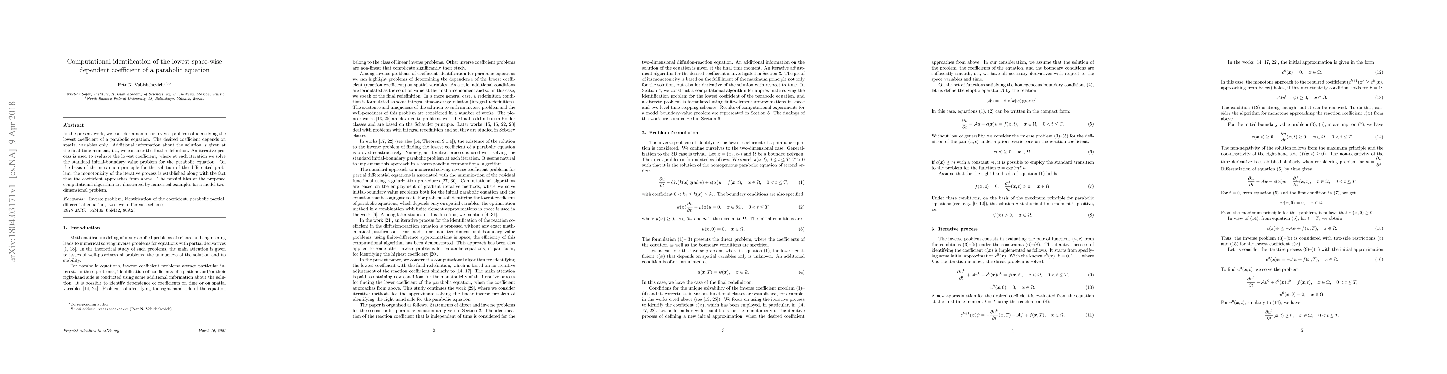This paper presents a computational method for identifying the lowest spatial coefficient of a parabolic equation through an iterative process. The method leverages the maximum principle to ensure monotonic convergence, and numerical examples demonstrate its effectiveness for a two-dimensional model problem.