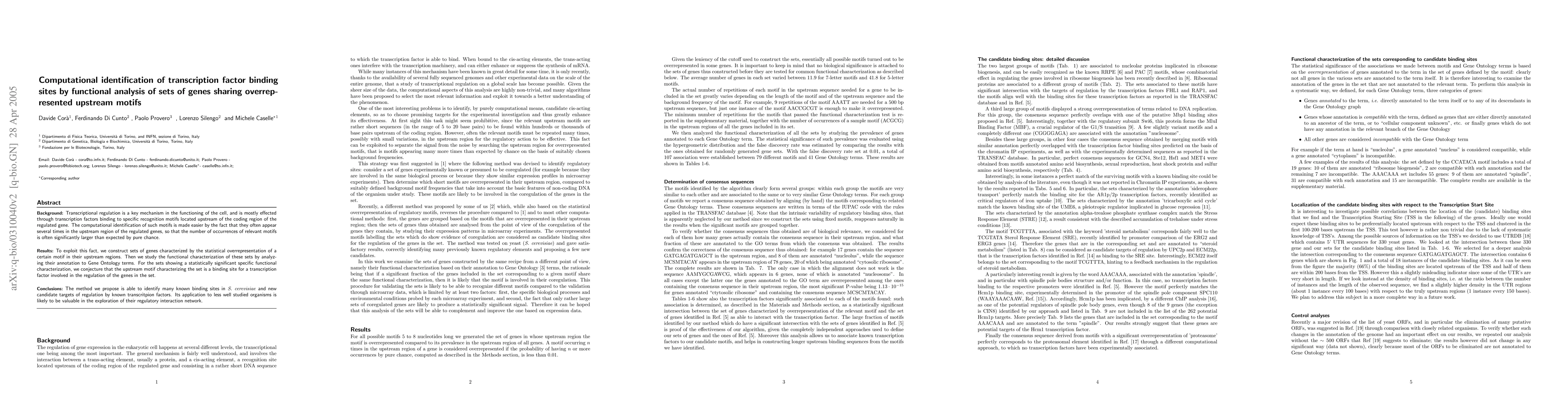 BACKGROUND: Transcriptional regulation is a key mechanism in the functioning of the cell, and is mostly effected through transcription factors binding to specific recognition motifs located upstream of the coding region of the regulated gene. The computational identification of such motifs is made easier by the fact that they often appear several times in the upstream region of the regulated genes, so that the number of occurrences of relevant motifs is often significantly larger than expected by pure chance. RESULTS: To exploit this fact, we construct sets of genes characterized by the statistical overrepresentation of a certain motif in their upstream regions. Then we study the functional characterization of these sets by analyzing their annotation to Gene Ontology terms. For the sets showing a statistically significant specific functional characterization, we conjecture that the upstream motif characterizing the set is a binding site for a transcription factor involved in the regulation of the genes in the set. CONCLUSIONS: The method we propose is able to identify many known binding sites in S. cerevisiae and new candidate targets of regulation by known transcription factors. Its application to less well studied organisms is likely to be valuable in the exploration of their regulatory interaction network.