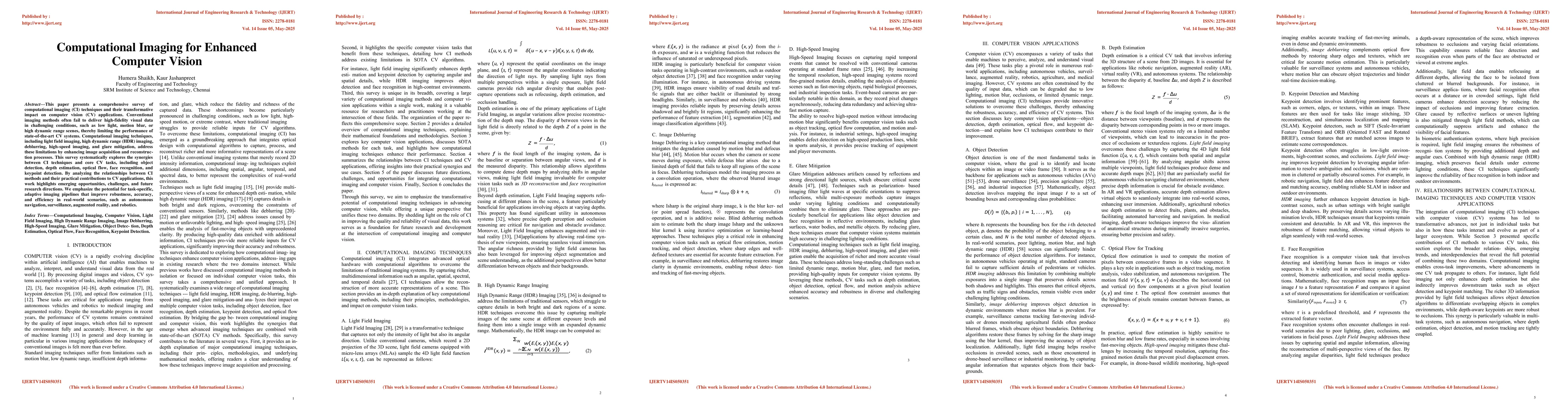 This paper presents a comprehensive survey of computational imaging (CI) techniques and their transformative impact on computer vision (CV) applications. Conventional imaging methods often fail to deliver high-fidelity visual data in challenging conditions, such as low light, motion blur, or high dynamic range scenes, thereby limiting the performance of state-of-the-art CV systems. Computational imaging techniques, including light field imaging, high dynamic range (HDR) imaging, deblurring, high-speed imaging, and glare mitigation, address these limitations by enhancing image acquisition and reconstruction processes. This survey systematically explores the synergies between CI techniques and core CV tasks, including object detection, depth estimation, optical flow, face recognition, and keypoint detection. By analyzing the relationships between CI methods and their practical contributions to CV applications, this work highlights emerging opportunities, challenges, and future research directions. We emphasize the potential for task-specific, adaptive imaging pipelines that improve robustness, accuracy, and efficiency in real-world scenarios, such as autonomous navigation, surveillance, augmented reality, and robotics.