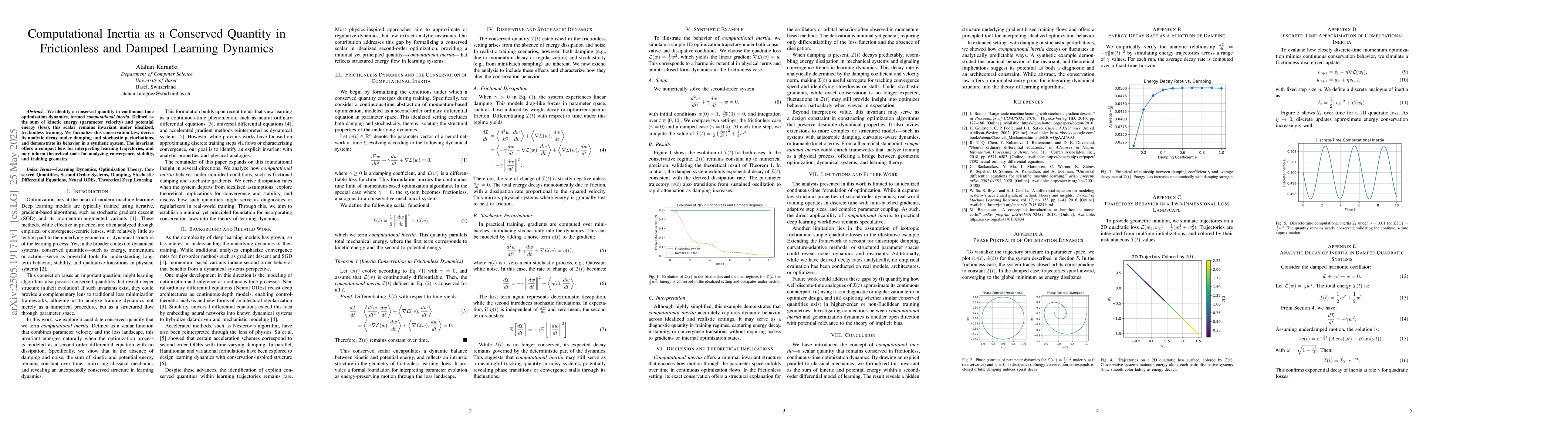 The research identifies a conserved quantity, termed computational inertia, in continuous-time optimization dynamics, defined as the sum of kinetic energy (parameter velocity) and potential energy (loss). It formalizes this conservation law, derives its analytic decay under damping and stochastic perturbations, and demonstrates its behavior in a synthetic system.