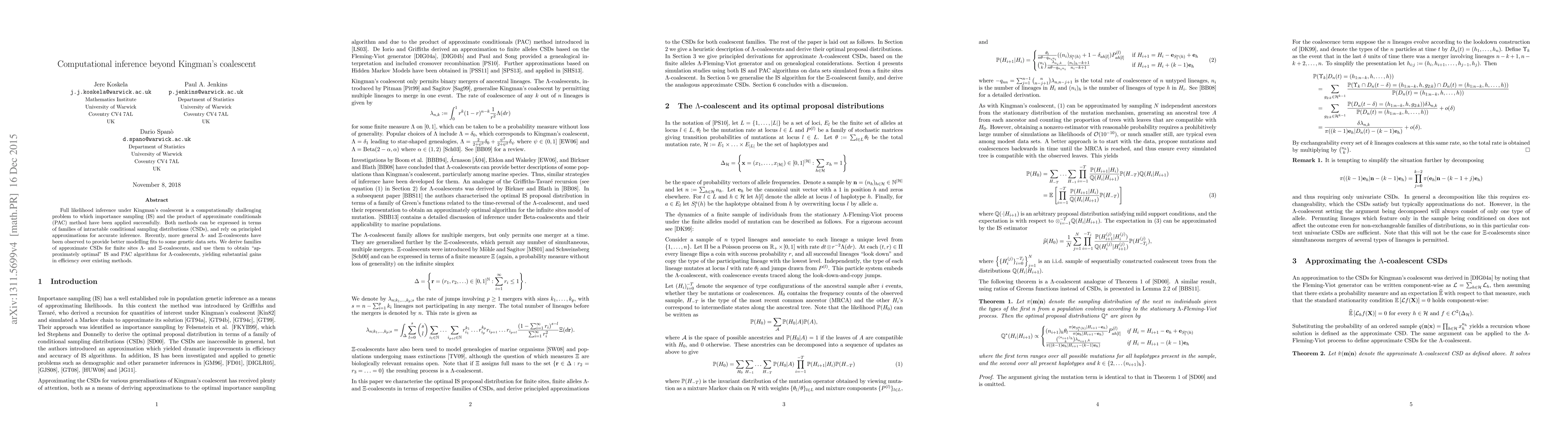 Full likelihood inference under Kingman's coalescent is a computationally challenging problem to which importance sampling (IS) and the product of approximate conditionals (PAC) method have been applied successfully. Both methods can be expressed in terms of families of intractable conditional sampling distributions (CSDs), and rely on principled approximations for accurate inference. Recently, more general $\Lambda$- and $\Xi$-coalescents have been observed to provide better modelling fits to some genetic data sets. We derive families of approximate CSDs for finite sites $\Lambda$- and $\Xi$-coalescents, and use them to obtain "approximately optimal" IS and PAC algorithms for $\Lambda$-coalescents, yielding substantial gains in efficiency over existing methods.