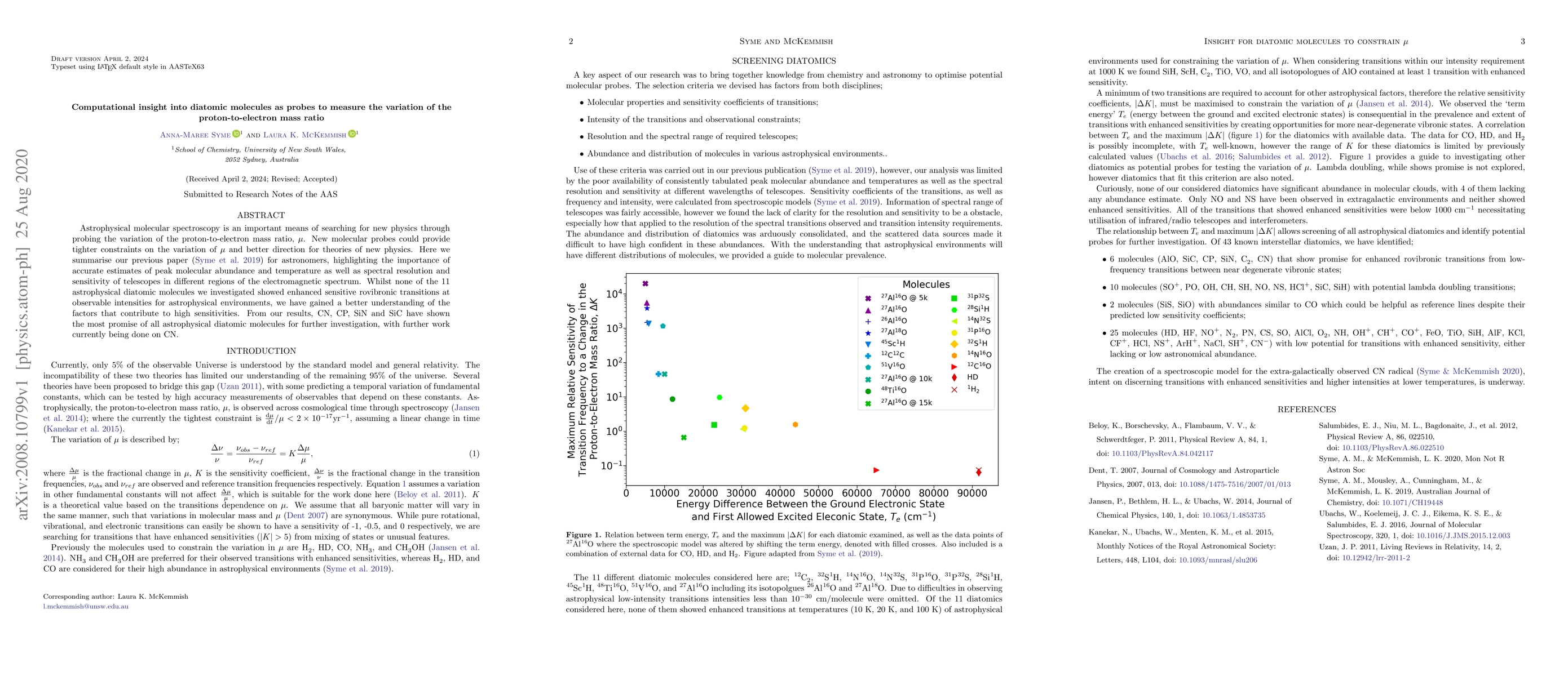 Astrophysical molecular spectroscopy is an important means of searching for new physics through probing the variation of the proton-to-electron mass ratio, $\mu$. New molecular probes could provide tighter constraints on the variation of $\mu$ and better direction for theories of new physics. Here we summarise our previous paper \citep{19SyMoCu.CN} for astronomers, highlighting the importance of accurate estimates of peak molecular abundance and temperature as well as spectral resolution and sensitivity of telescopes in different regions of the electromagnetic spectrum. Whilst none of the 11 astrophysical diatomic molecules we investigated showed enhanced sensitive rovibronic transitions at observable intensities for astrophysical environments, we have gained a better understanding of the factors that contribute to high sensitivities. From our results, CN, CP, SiN and SiC have shown the most promise of all astrophysical diatomic molecules for further investigation, with further work currently being done on CN.