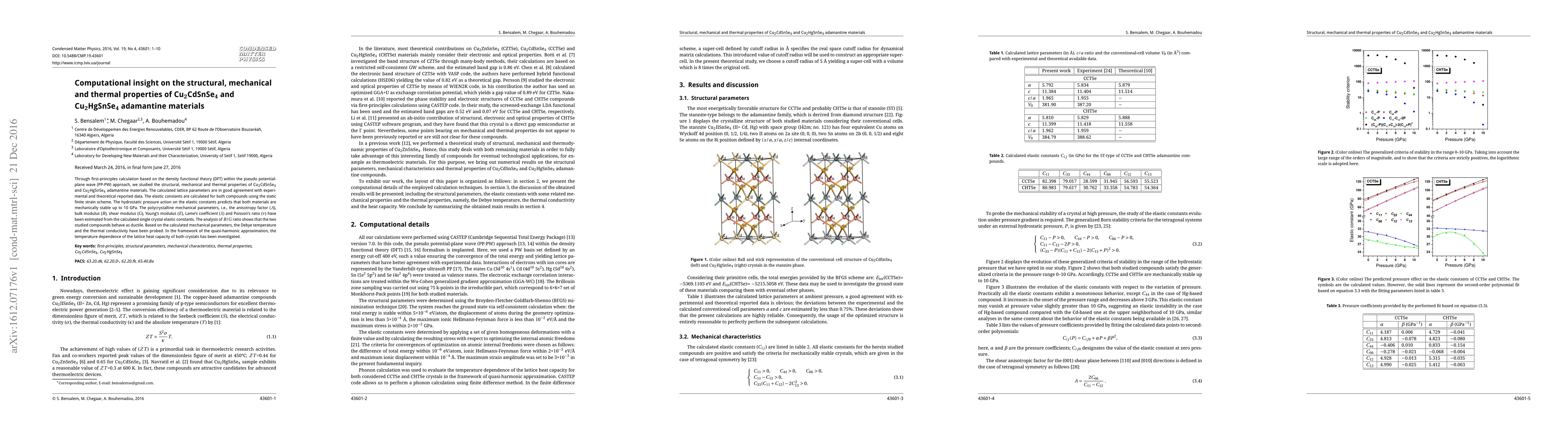 This paper uses first-principles DFT calculations to investigate the structural, mechanical, and thermal properties of Cu$_2$CdSnSe$_4$ and Cu$_2$HgSnSnSe$_4$ adamantine materials, finding both compounds to be mechanically stable and ductile up to 10 GPa, with calculated thermal properties and lattice heat capacity.