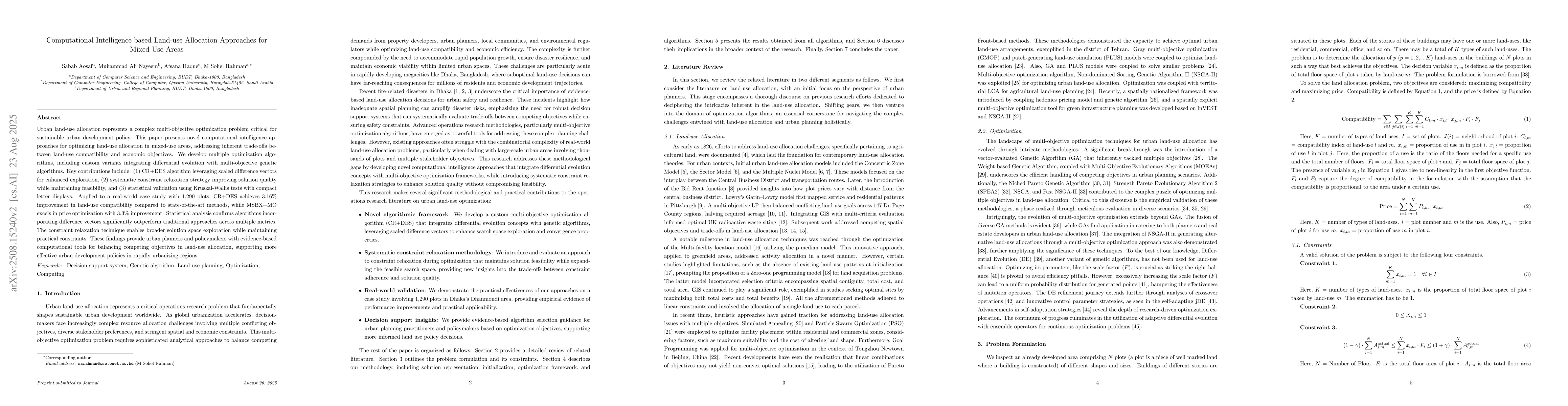 Urban land-use allocation represents a complex multi-objective optimization problem critical for sustainable urban development policy. This paper presents novel computational intelligence approaches for optimizing land-use allocation in mixed-use areas, addressing inherent trade-offs between land-use compatibility and economic objectives. We develop multiple optimization algorithms, including custom variants integrating differential evolution with multi-objective genetic algorithms. Key contributions include: (1) CR+DES algorithm leveraging scaled difference vectors for enhanced exploration, (2) systematic constraint relaxation strategy improving solution quality while maintaining feasibility, and (3) statistical validation using Kruskal-Wallis tests with compact letter displays. Applied to a real-world case study with 1,290 plots, CR+DES achieves 3.16\% improvement in land-use compatibility compared to state-of-the-art methods, while MSBX+MO excels in price optimization with 3.3\% improvement. Statistical analysis confirms algorithms incorporating difference vectors significantly outperform traditional approaches across multiple metrics. The constraint relaxation technique enables broader solution space exploration while maintaining practical constraints. These findings provide urban planners and policymakers with evidence-based computational tools for balancing competing objectives in land-use allocation, supporting more effective urban development policies in rapidly urbanizing regions.