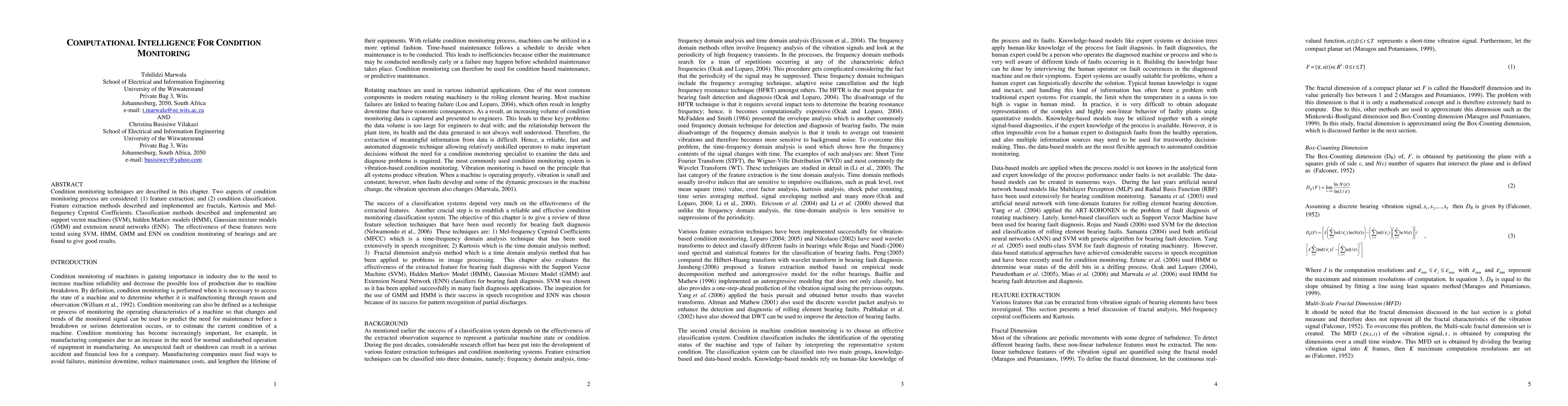 This paper explores computational intelligence techniques for condition monitoring, focusing on feature extraction methods like fractals, Kurtosis, and Mel-frequency Cepstral Coefficients, and classification methods including SVM, HMM, GMM, and ENN. The effectiveness of these methods is demonstrated through successful condition monitoring of bearings.