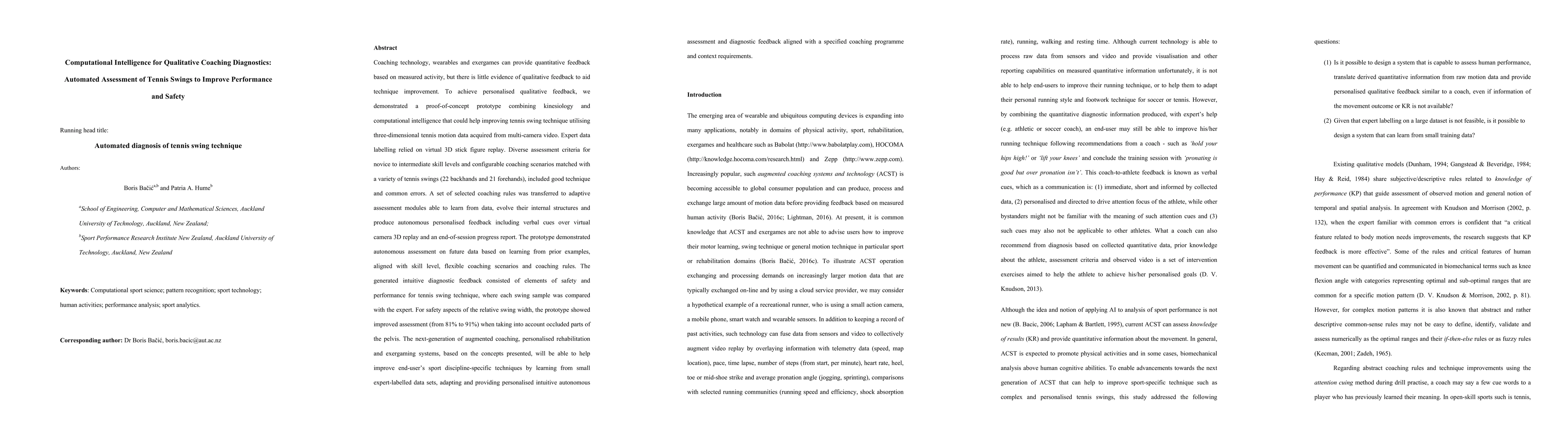 Coaching technology, wearables and exergames can provide quantitative feedback based on measured activity, but there is little evidence of qualitative feedback to aid technique improvement. To achieve personalised qualitative feedback, we demonstrated a proof-of-concept prototype combining kinesiology and computational intelligence that could help improving tennis swing technique utilising three-dimensional tennis motion data acquired from multi-camera video. Expert data labelling relied on virtual 3D stick figure replay. Diverse assessment criteria for novice to intermediate skill levels and configurable coaching scenarios matched with a variety of tennis swings (22 backhands and 21 forehands), included good technique and common errors. A set of selected coaching rules was transferred to adaptive assessment modules able to learn from data, evolve their internal structures and produce autonomous personalised feedback including verbal cues over virtual camera 3D replay and an end-of-session progress report. The prototype demonstrated autonomous assessment on future data based on learning from prior examples, aligned with skill level, flexible coaching scenarios and coaching rules. The generated intuitive diagnostic feedback consisted of elements of safety and performance for tennis swing technique, where each swing sample was compared with the expert. For safety aspects of the relative swing width, the prototype showed improved assessment ...