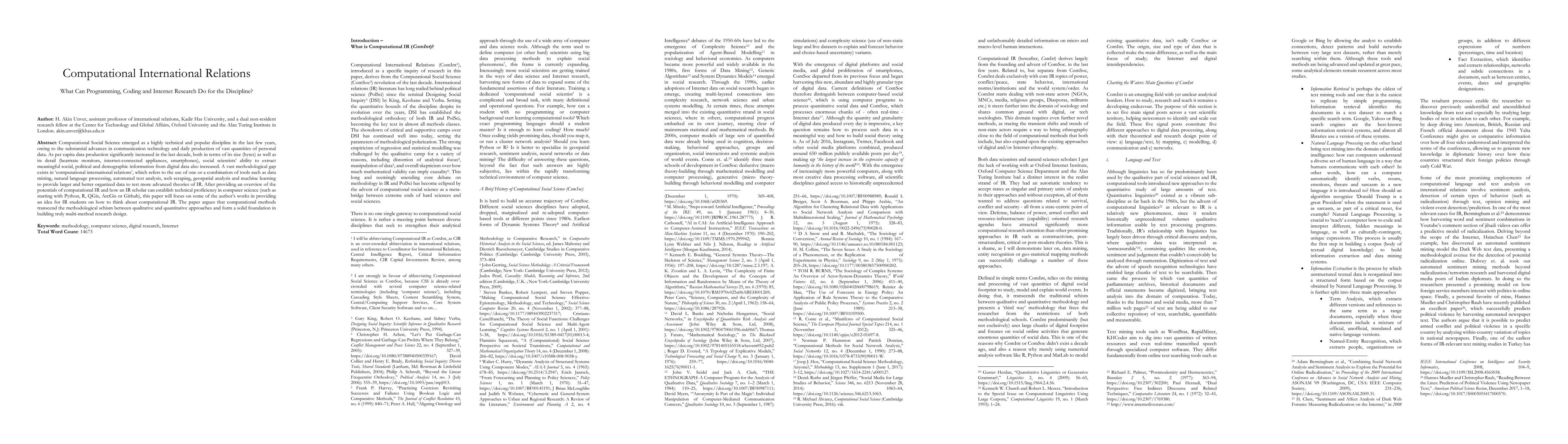 Computational Social Science emerged as a highly technical and popular discipline in the last few years, owing to the substantial advances in communication technology and daily production of vast quantities of personal data. As per capita data production significantly increased in the last decade, both in terms of its size, bytes, as well as its detail, heart rate monitors, Internet connected appliances, smartphones, social scientists ability to extract meaningful social, political and demographic information from digital data also increased. A vast methodological gap exists in computational international relations, or ComInt, which refers to the use of one or a combination of tools such as data mining, natural language processing, automated text analysis, web scraping, geospatial analysis and machine learning to provide larger and better organized data to test more advanced theories of IR. After providing an overview of the potentials of computational IR and how an IR scholar can establish technical proficiency in computer science, such as starting with Python, R, QGis, ArcGIS or Github, this paper will focus on some of the author's works in providing an idea for IR students on how to think about computational IR. The paper argues that computational methods transcend the methodological schism between qualitative and quantitative approaches and form a solid foundation for building truly multi method research design.