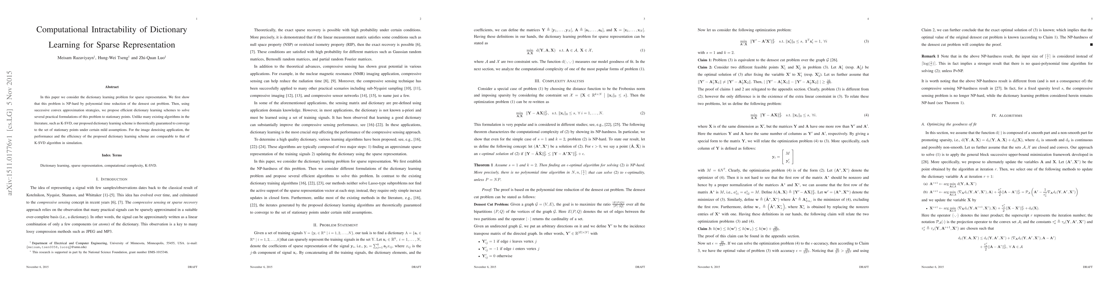 This paper demonstrates that dictionary learning for sparse representation is NP-hard, proposing efficient successive convex approximation strategies to reach stationary points. Unlike existing methods, the proposed scheme guarantees convergence under certain conditions, showing comparable performance to K-SVD in image denoising simulations.