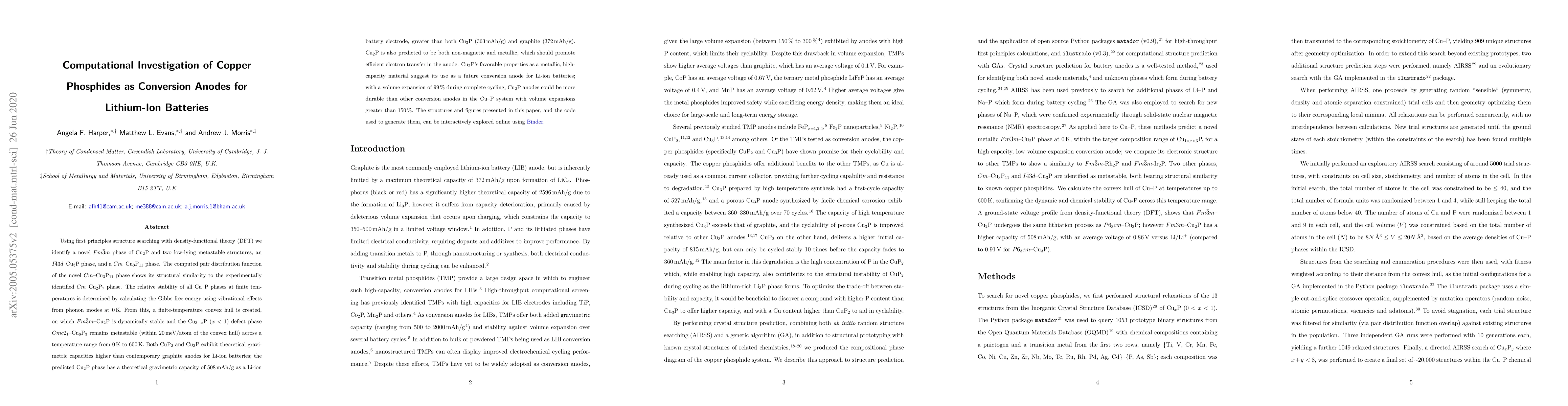 Using first principles structure searching with density-functional theory (DFT) we identify a novel $Fm\bar{3}m$ phase of Cu$_2$P and two low-lying metastable structures, an $I\bar{4}3d$--Cu$_3$P phase, and a $Cm$--Cu$_3$P$_{11}$ phase. The computed pair distribution function of the novel $Cm$--Cu$_3$P$_{11}$ phase shows its structural similarity to the experimentally identified $Cm$--Cu$_2$P$_7$ phase. The relative stability of all Cu--P phases at finite temperatures is determined by calculating the Gibbs free energy using vibrational effects from phonon modes at 0 K. From this, a finite-temperature convex hull is created, on which $Fm\bar{3}m$--Cu$_2$P is dynamically stable and the Cu$_{3-x}$P ($x < 1$) defect phase $Cmc2_1$--Cu$_8$P$_3$ remains metastable (within 20 meV/atom of the convex hull) across a temperature range from 0 K to 600 K. Both CuP$_2$ and Cu$_3$P exhibit theoretical gravimetric capacities higher than contemporary graphite anodes for Li-ion batteries; the predicted Cu$_2$P phase has a theoretical gravimetric capacity of 508 mAh/g as a Li-ion battery electrode, greater than both Cu$_3$P (363 mAh/g) and graphite (372 mAh/g). Cu$_2$P is also predicted to be both non-magnetic and metallic, which should promote efficient electron transfer in the anode. Cu$_2$P's favorable properties as a metallic, high-capacity material suggest its use as a future conversion anode for Li-ion batteries; with a volume expansion of 99% during complete cycling, Cu$_2$P anodes could be more durable than other conversion anodes in the Cu--P system with volume expansions greater than 150%.