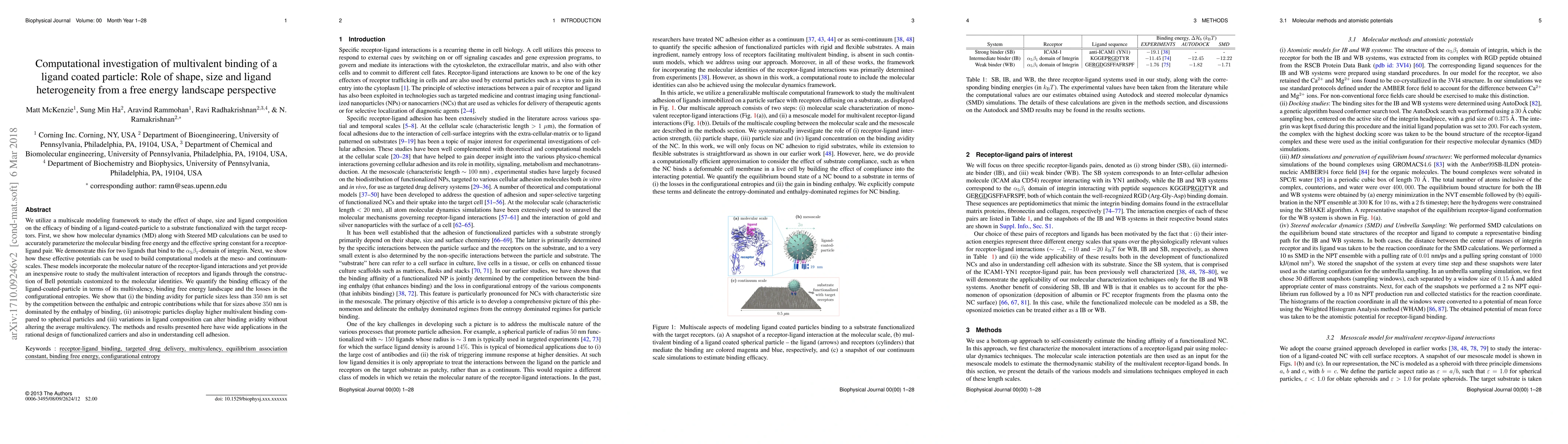 We utilize a multiscale modeling framework to study the effect of shape, size and ligand composition on the efficacy of binding of a ligand-coated-particle to a substrate functionalized with the target receptors. First, we show how molecular dynamics (MD) along with Steered MD calculations can be used to accurately parameterize the molecular binding free energy and the effective spring constant for a receptor-ligand pair. We demonstrate this for two ligands that bind to the $\alpha_5\beta_1$-domain of integrin. Next, we show how these effective potentials can be used to build computational models at the meso- and continuum- scales. These models incorporate the molecular nature of the receptor-ligand interactions and yet provide an inexpensive route to study the multivalent interaction of receptors and ligands through the construction of Bell potentials customized to the molecular identities. We quantify the binding efficacy of the ligand-coated-particle in terms of its multivalency, binding free energy landscape and the losses in the configurational entropies. We show that (i) the binding avidity for particle sizes less than $350$ nm is set by the competition between the enthalpic and entropic contributions while that for sizes above $350$ nm is dominated by the enthalpy of binding, (ii) anisotropic particles display higher multivalent binding compared to spherical particles and (iii) variations in ligand composition can alter binding avidity without altering the average multivalency. The methods and results presented here have wide applications in the rational design of functionalized carriers and also in understanding cell adhesion.