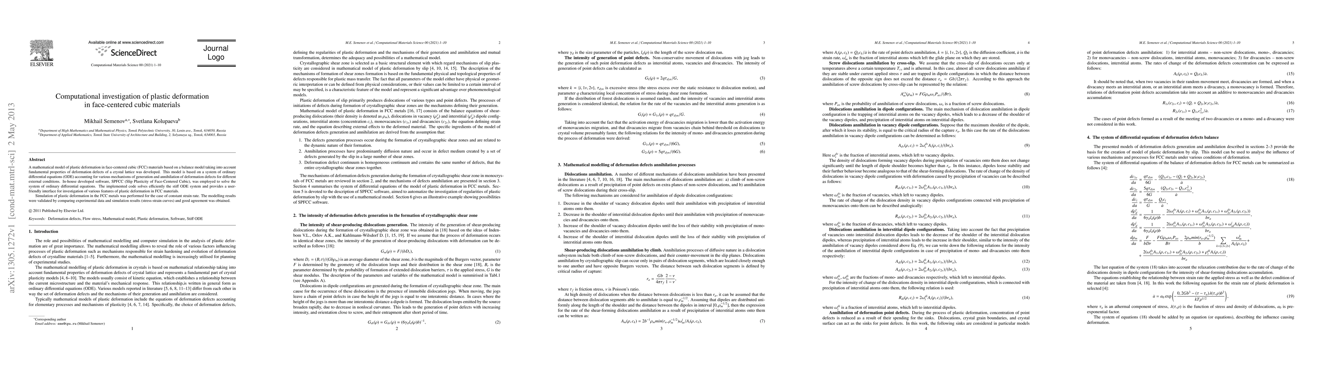 This paper develops a mathematical model for plastic deformation in face-centered cubic materials using a balance model and ordinary differential equations, and employs SPFCC software to solve the equations. The model's accuracy is validated by comparing simulation results with experimental data, showing good agreement.