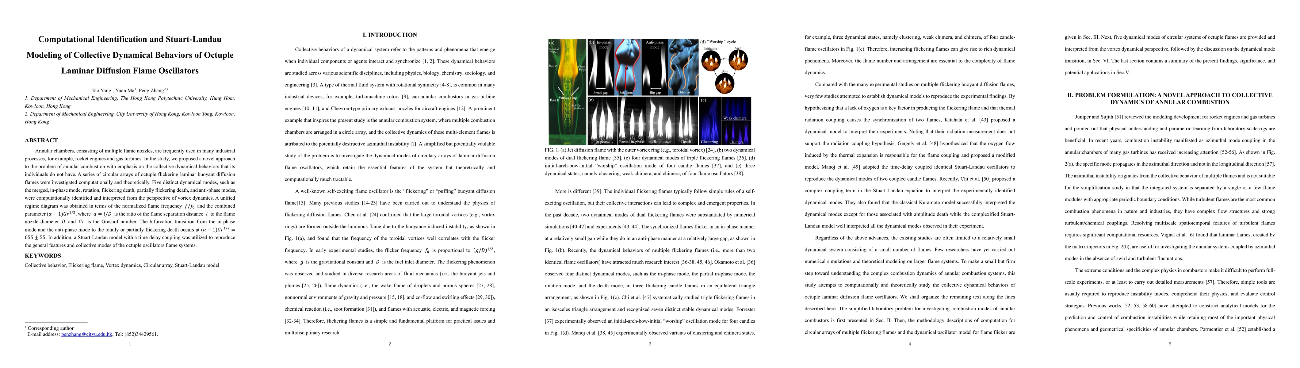This paper investigates the collective dynamical behaviors of flickering laminar buoyant diffusion flames in circular arrays through computational simulations. Five distinct dynamical modes were identified and analyzed, revealing that these modes are governed by dimensionless parameters and leading to a unified regime diagram.