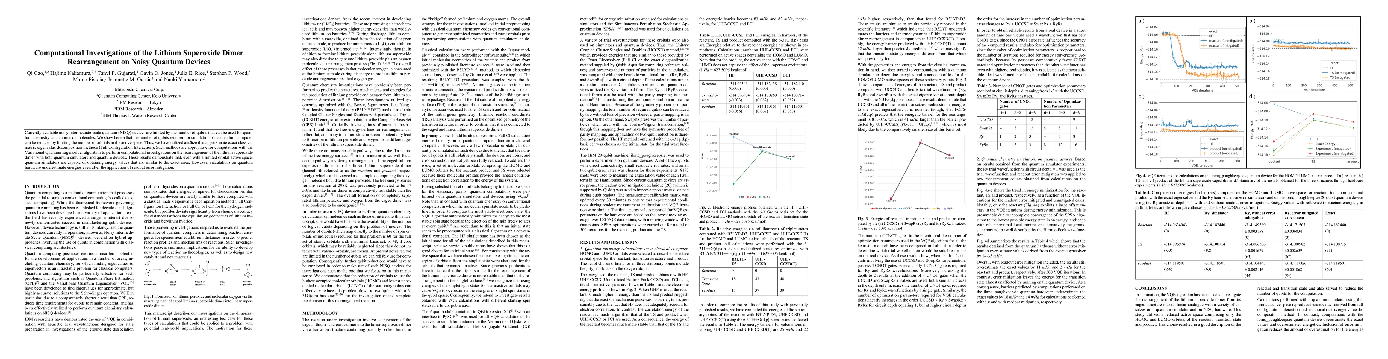 Currently available noisy intermediate-scale quantum (NISQ) devices are limited by the number of qubits that can be used for quantum chemistry calculations on molecules. We show herein that the number of qubits required for simulations on a quantum computer can be reduced by limiting the number of orbitals in the active space. Thus, we have utilized ans\"atze that approximate exact classical matrix eigenvalue decomposition methods (Full Configuration Interaction). Such methods are appropriate for computations with the Variational Quantum Eigensolver algorithm to perform computational investigations on the rearrangement of the lithium superoxide dimer with both quantum simulators and quantum devices. These results demonstrate that, even with a limited orbital active space, quantum simulators are capable of obtaining energy values that are similar to the exact ones. However, calculations on quantum hardware underestimate energies even after the application of readout error mitigation.