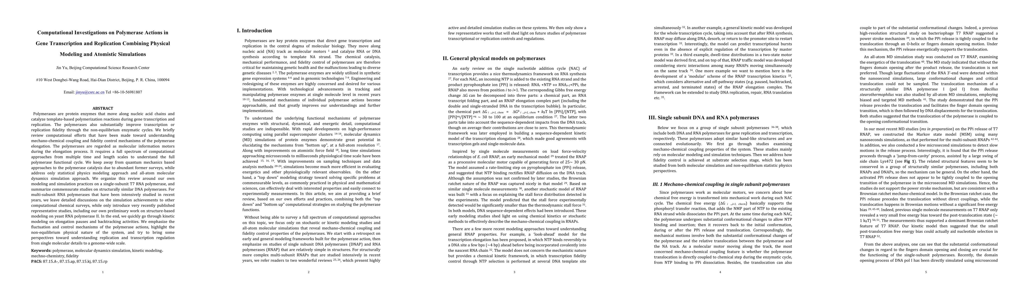 This paper reviews computational studies on polymerase actions in gene transcription and replication, focusing on physical modeling and atomistic simulations. It highlights the non-equilibrium enzymatic cycles and fidelity control mechanisms of polymerases, emphasizing the importance of statistical physics and molecular dynamics simulations to understand their functional cycles and regulatory mechanisms.