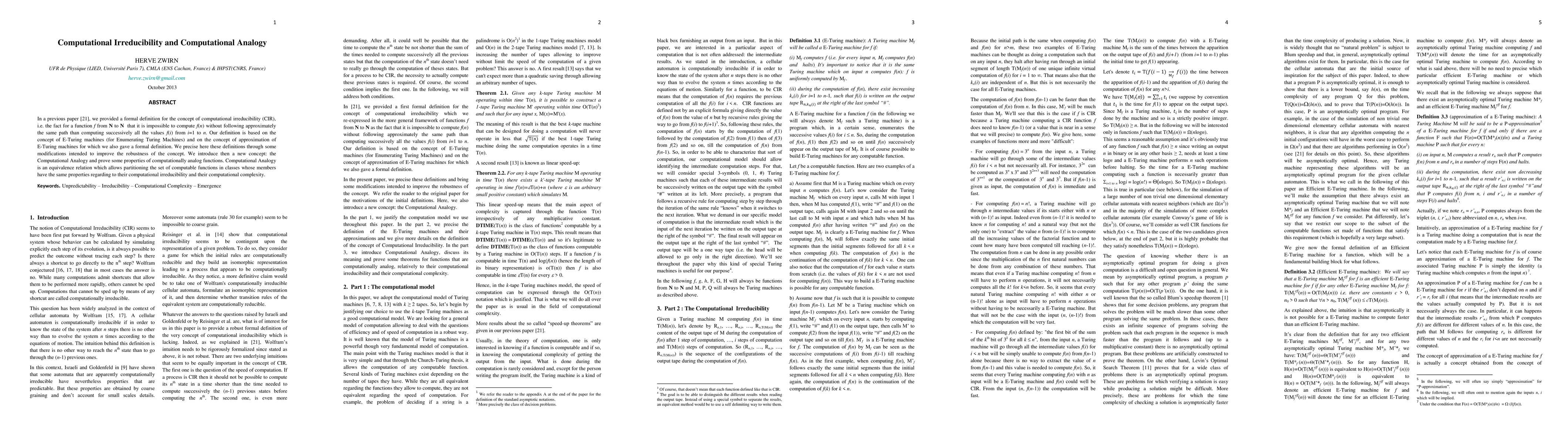 In a previous paper, we provided a formal definition for the concept of computational irreducibility (CIR), i.e. the fact for a function f from N to N that it is impossible to compute f(n) without following approximately the same path than computing successively all the values f(i) from i=1 to n. Our definition is based on the concept of E Turing machines (for Enumerating Turing Machines) and on the concept of approximation of E Turing machines for which we also gave a formal definition. We precise here these definitions through some modifications intended to improve the robustness of the concept. We introduce then a new concept: the Computational Analogy and prove some properties of computationally analog functions. Computational Analogy is an equivalence relation which allows partitioning the set of computable functions in classes whose members have the same properties regarding to their computational irreducibility and their computational complexity.
