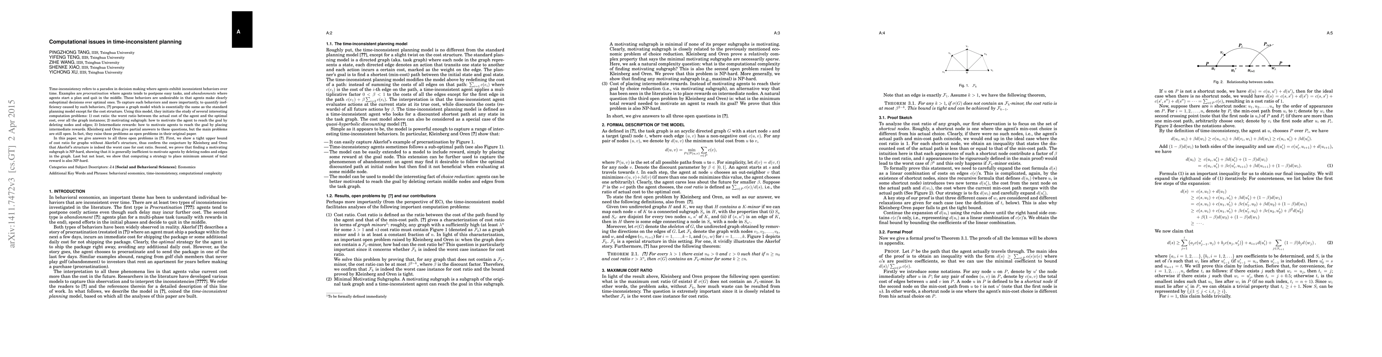 Time-inconsistency refers to a paradox in decision making where agents exhibit inconsistent behaviors over time. Examples are procrastination where agents tends to costly postpone easy tasks, and abandonments where agents start a plan and quit in the middle. These behaviors are undesirable in the sense that agents make clearly suboptimal decisions over optimal ones. To capture such behaviors and more importantly, to quantify inefficiency caused by such behaviors, [Kleinberg & Oren 2014] propose a graph model which is essentially same as the standard planning model except for the cost structure. Using this model, they initiate the study of several interesting problems: 1) cost ratio: the worst ratio between the actual cost of the agent and the optimal cost, over all graph instances; 2) motivating subgraph: how to motivate the agent to reach the goal by deleting nodes and edges; 3) Intermediate rewards: how to motivate agents to reach the goal by placing intermediate rewards. Kleinberg and Oren give partial answers to these questions, but the main problems are still open. In fact, they raise these problems explicitly as open problems in their paper. In this paper, we give answers to all three open problems in [Kleinberg & Oren 2014]. First, we show a tight upper bound of cost ratio for graphs without Akerlof's structure, thus confirm the conjecture by Kleinberg and Oren that Akerlof's structure is indeed the worst case for cost ratio. Second, we prove that finding a motivating subgraph is NP-hard, showing that it is generally inefficient to motivate agents by deleting nodes and edges in the graph. Last but not least, we show that computing a strategy to place minimum amount of total reward is also NP-hard. Therefore, it is computational inefficient to motivate agents by placing intermediate rewards. The techniques we use to prove these results are nontrivial and of independent interests.