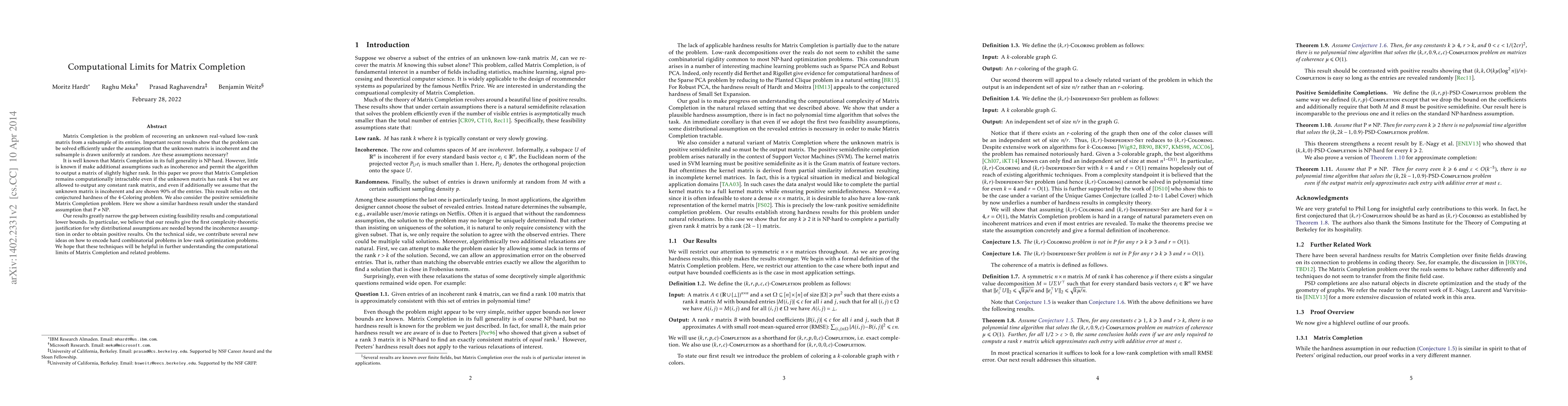 Matrix Completion is the problem of recovering an unknown real-valued low-rank matrix from a subsample of its entries. Important recent results show that the problem can be solved efficiently under the assumption that the unknown matrix is incoherent and the subsample is drawn uniformly at random. Are these assumptions necessary? It is well known that Matrix Completion in its full generality is NP-hard. However, little is known if make additional assumptions such as incoherence and permit the algorithm to output a matrix of slightly higher rank. In this paper we prove that Matrix Completion remains computationally intractable even if the unknown matrix has rank $4$ but we are allowed to output any constant rank matrix, and even if additionally we assume that the unknown matrix is incoherent and are shown $90%$ of the entries. This result relies on the conjectured hardness of the $4$-Coloring problem. We also consider the positive semidefinite Matrix Completion problem. Here we show a similar hardness result under the standard assumption that $\mathrm{P}\ne \mathrm{NP}.$ Our results greatly narrow the gap between existing feasibility results and computational lower bounds. In particular, we believe that our results give the first complexity-theoretic justification for why distributional assumptions are needed beyond the incoherence assumption in order to obtain positive results. On the technical side, we contribute several new ideas on how to encode hard combinatorial problems in low-rank optimization problems. We hope that these techniques will be helpful in further understanding the computational limits of Matrix Completion and related problems.