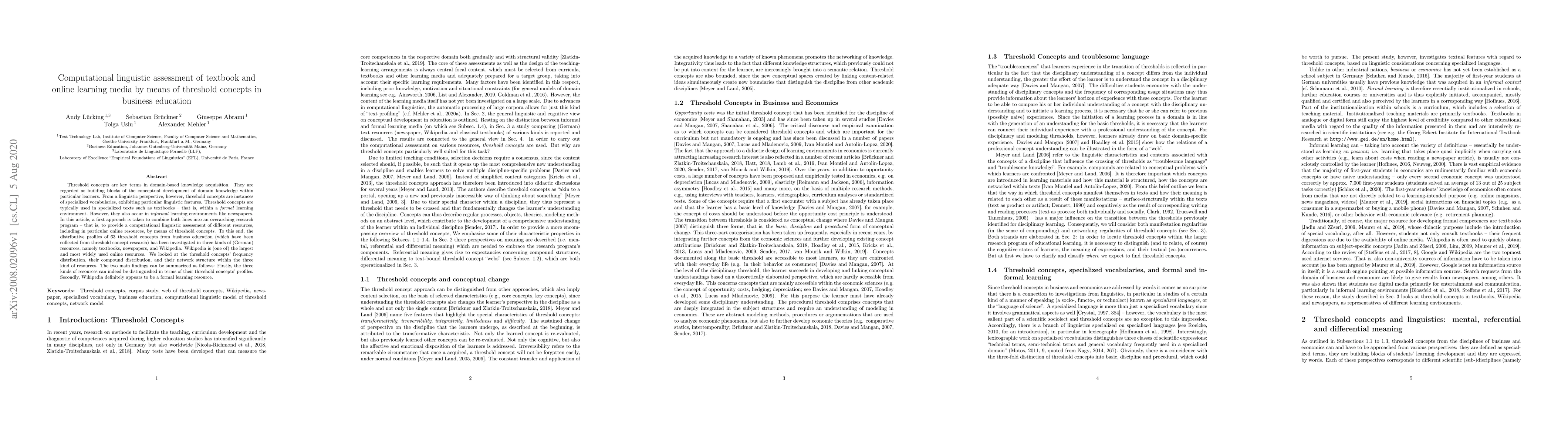 Threshold concepts are key terms in domain-based knowledge acquisition. They are regarded as building blocks of the conceptual development of domain knowledge within particular learners. From a linguistic perspective, however, threshold concepts are instances of specialized vocabularies, exhibiting particular linguistic features. Threshold concepts are typically used in specialized texts such as textbooks -- that is, within a formal learning environment. However, they also occur in informal learning environments like newspapers. In this article, a first approach is taken to combine both lines into an overarching research program - that is, to provide a computational linguistic assessment of different resources, including in particular online resources, by means of threshold concepts. To this end, the distributive profiles of 63 threshold concepts from business education (which have been collected from threshold concept research) has been investigated in three kinds of (German) resources, namely textbooks, newspapers, and Wikipedia. Wikipedia is (one of) the largest and most widely used online resources. We looked at the threshold concepts' frequency distribution, their compound distribution, and their network structure within the three kind of resources. The two main findings can be summarized as follows: Firstly, the three kinds of resources can indeed be distinguished in terms of their threshold concepts' profiles. Secondly, Wikipedia definitely appears to be a formal learning resource.