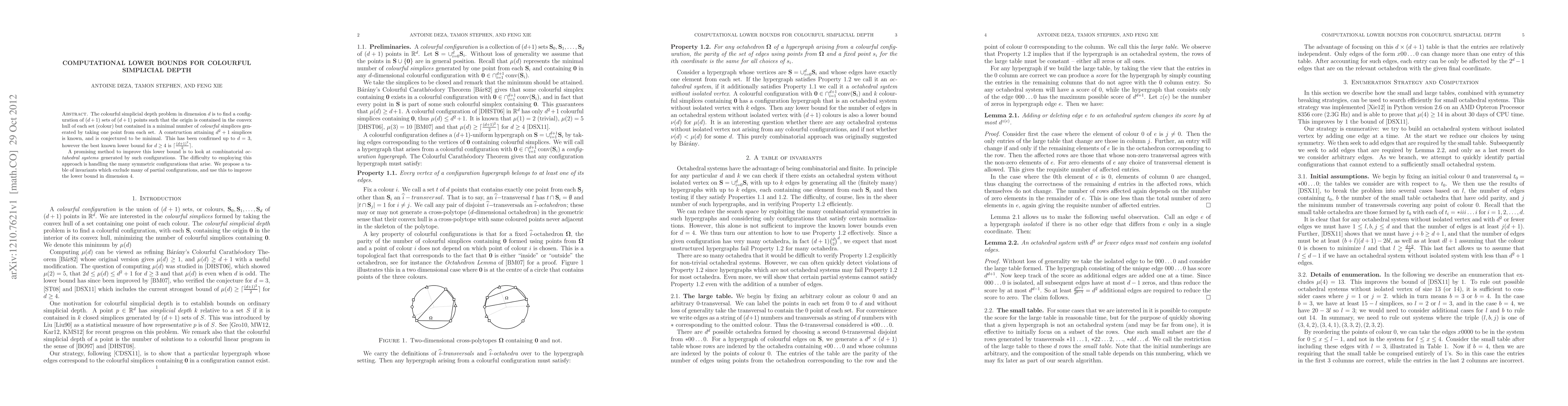Researchers improved a lower bound for the colourful simplicial depth problem in dimension 4 by using a table of invariants to exclude symmetric configurations, bringing it closer to the conjectured minimal construction.