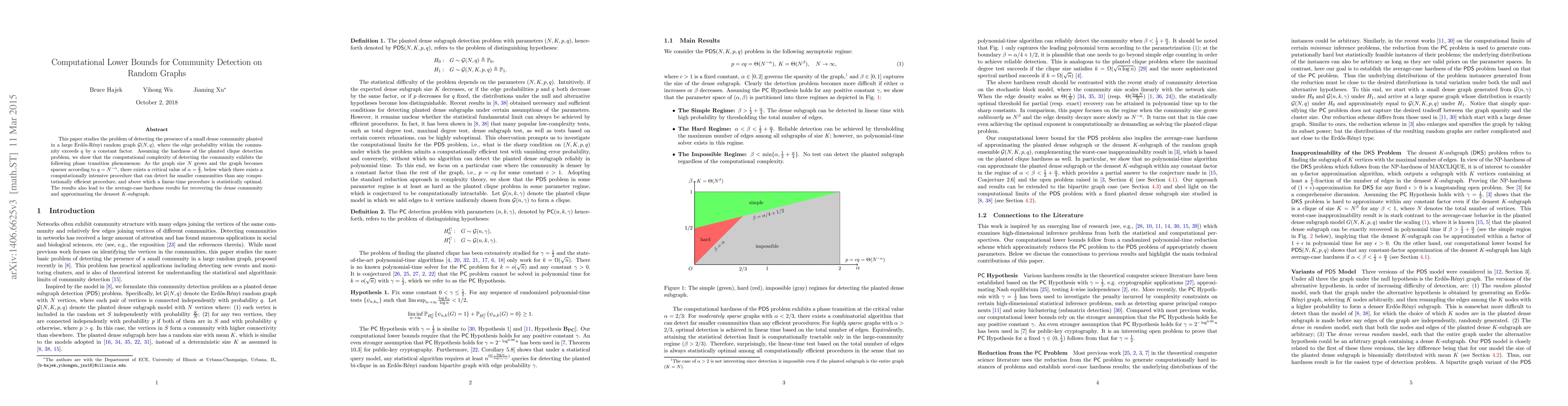 The paper studies the computational complexity of detecting a small dense community in large Erdős-Rényi random graphs, using the hardness of planted clique detection as a basis.