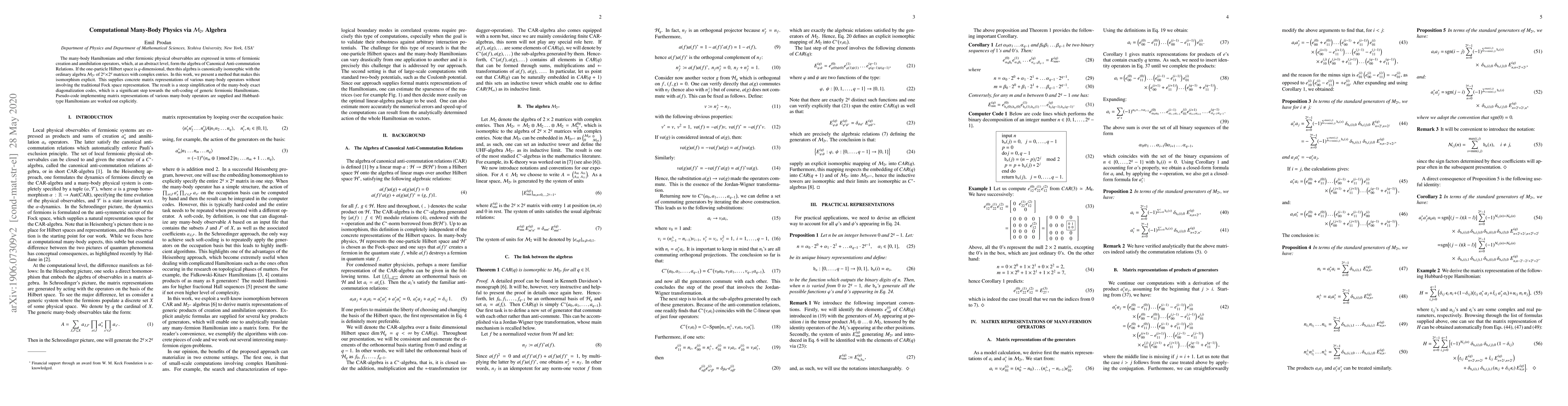 The many-body Hamiltonians and other fermionic physical observables are expressed in terms of fermionic creation and annihilation operators, which form the algebra of canonical anti-commutation relations (CAR). In this work we use a canonical isomorphism between CAR and $\mathcal M_{2^\infty}$ algebras to derive analytic matrix representations of many-fermion operators. Code-lines implementing these matrix representations are supplied and Hubbard-type Hamiltonians are worked out explicitly.