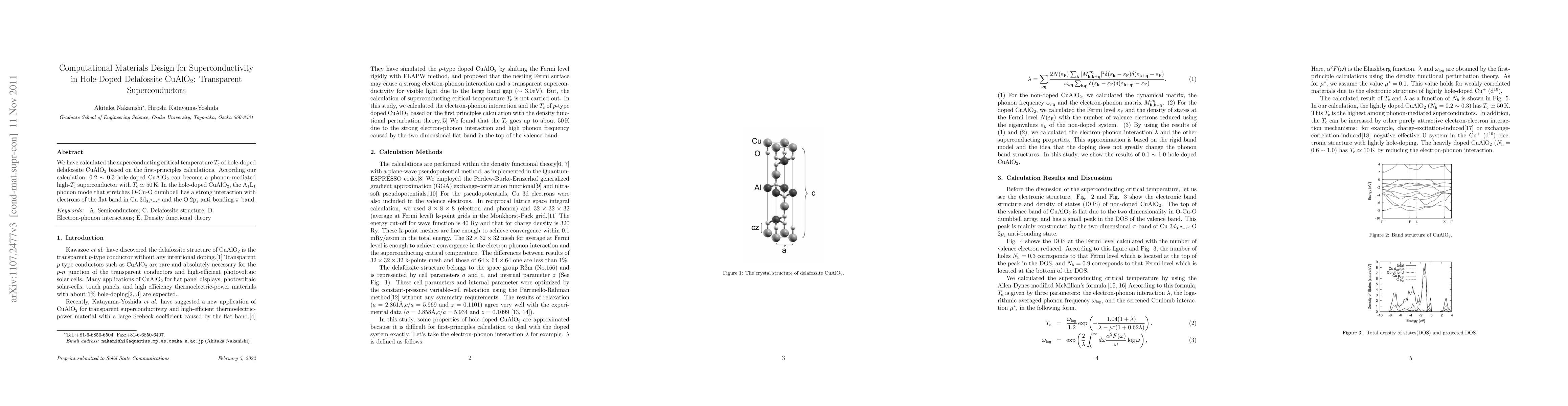 We have calculated the superconducting critical temperature $T_c$ of hole-doped delafossite CuAlO$_2$ based on the first-principles calculations. According our calculation, $0.2\sim0.3$ hole-doped CuAlO$_2$ can become a phonon-mediated high-$T_c$ superconductor with $T_c\sim50$ K. In the hole-doped CuAlO$_2$, the A$_1$L$_1$ phonon mode that stretches O-Cu-O dumbbell has a strong electron-phonon interaction with electrons of the flat band in Cu 3d$_{3z^2-r^2}$ and the O 2p$_z$ anti-bonding $\pi$-band.