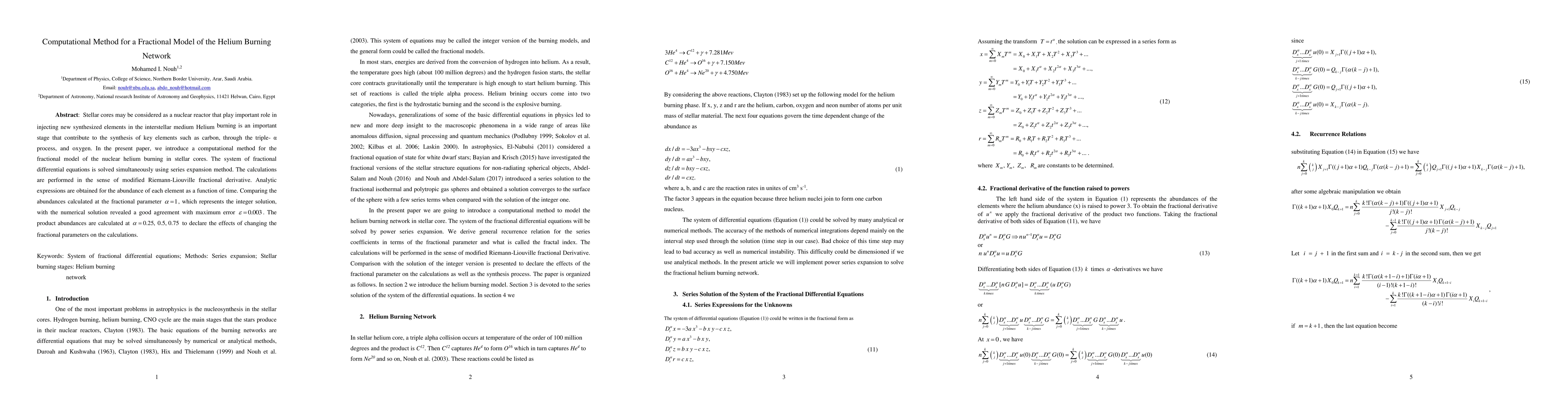 This paper introduces a computational method for modeling helium burning in stellar cores using fractional differential equations, achieving good agreement with numerical solutions at certain fractional parameters.
