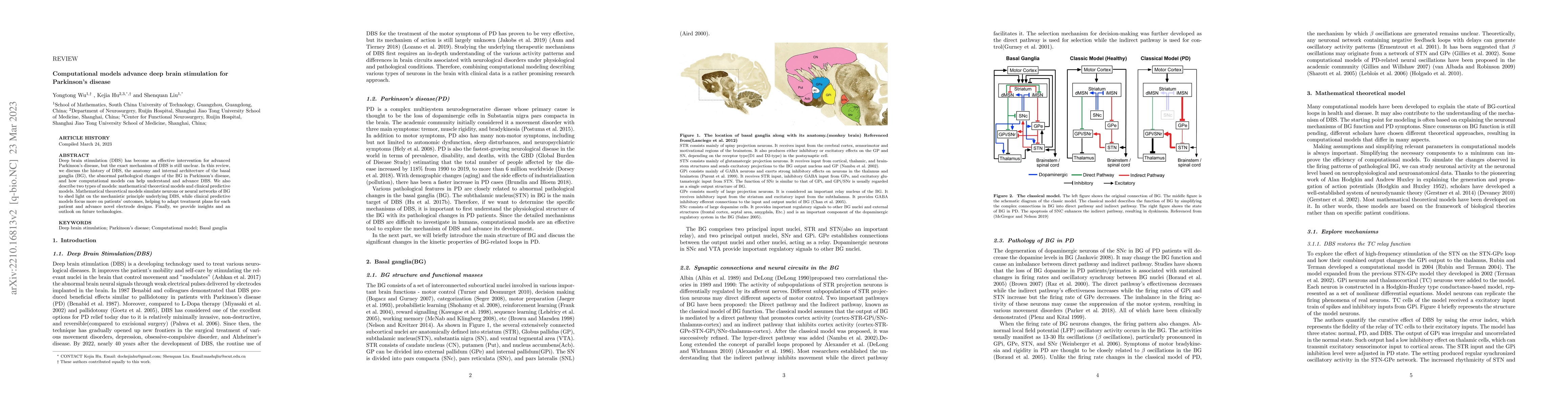 Deep brain stimulation(DBS)has become an effective intervention for advanced Parkinson's disease, but the exact mechanism of DBS is still unclear. In this review, we discuss the history of DBS, the anatomy and internal architecture of the basal ganglia(BG), the abnormal pathological changes of the BG in Parkinson's disease, and how computational models can help understand and advance DBS. We also describe two types of models:mathematical theoretical models and clinical predictive models. Mathematical theoretical models simulate neurons or neural networks of BG to shed light on the mechanistic principle underlying DBS, while clinical predictive models focus more on patients' outcomes, helping to adapt treatment plans for each patient and advance novel electrode designs. Finally, we provide insights and an outlook on future technologies.