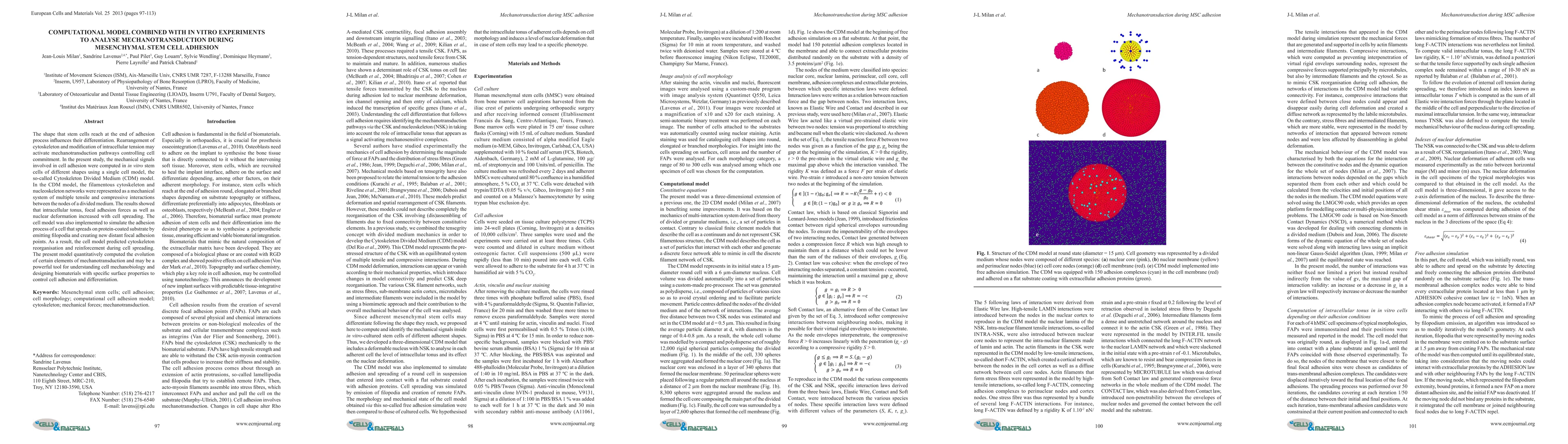 This study combines computational modeling with in vitro experiments to analyze mechanotransduction during mesenchymal stem cell adhesion, revealing that cytoskeleton rearrangement and intracellular tension influence cell differentiation. The Cytoskeleton Divided Medium (CDM) model predicts increased intracellular tonus and nuclear deformation with cell spreading, offering insights into cell mechanobiology and biomaterial design.
