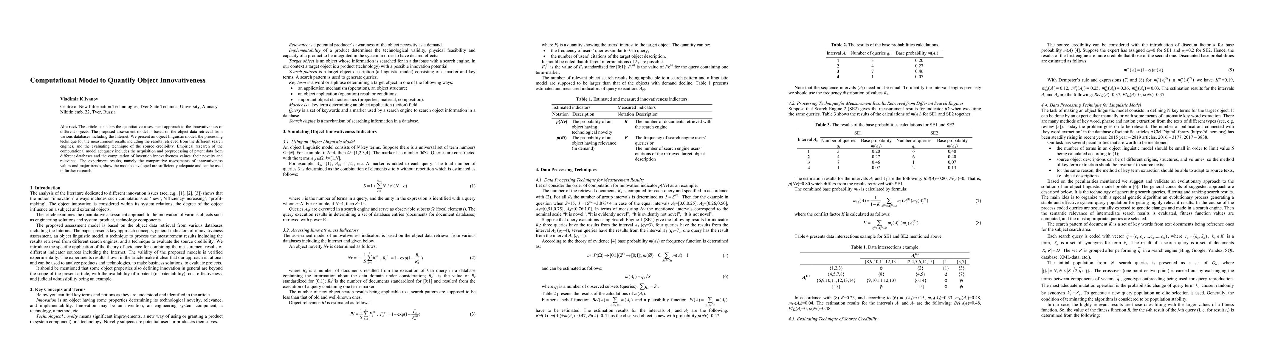 This paper proposes a computational model to quantify the innovativeness of objects, utilizing data from various databases and search engines. The model includes an object linguistic framework and techniques for evaluating source credibility, validated through patent data analysis, demonstrating its adequacy for assessing novelty and relevance.