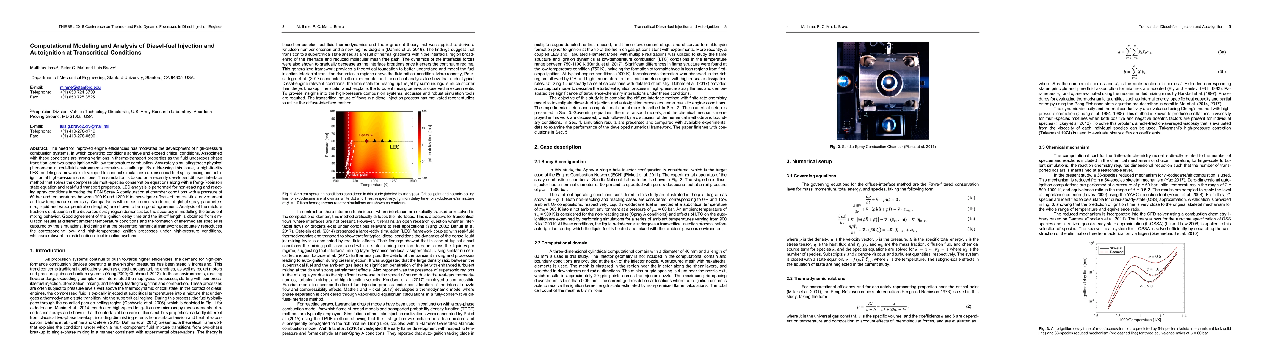 This paper develops a high-fidelity large eddy simulation (LES) framework to model diesel-fuel injection and autoignition under transcritical conditions, achieving good agreement with experimental data on spray parameters and ignition processes. The model employs a diffused interface method for real-fluid properties and low-temperature chemistry, capturing the complex behavior of fuel spray mixing and ignition at high pressures.