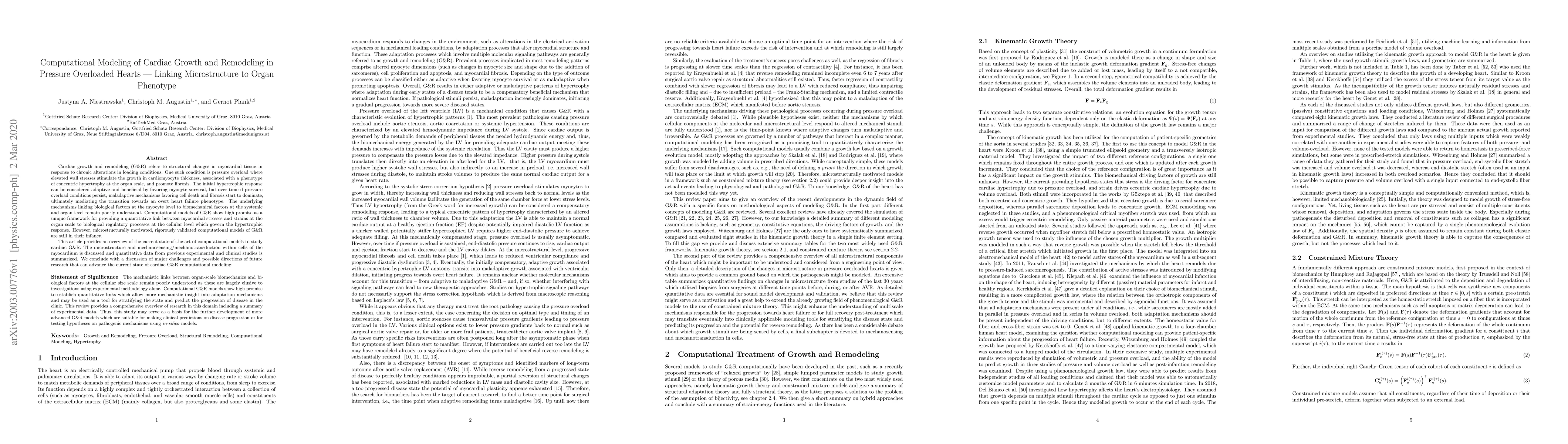 This paper reviews computational models linking cardiac growth and remodeling in pressure-overloaded hearts, emphasizing the need for microstructurally motivated models to bridge cellular biological processes and systemic biomechanical factors. It highlights current challenges and future research directions to advance the field.