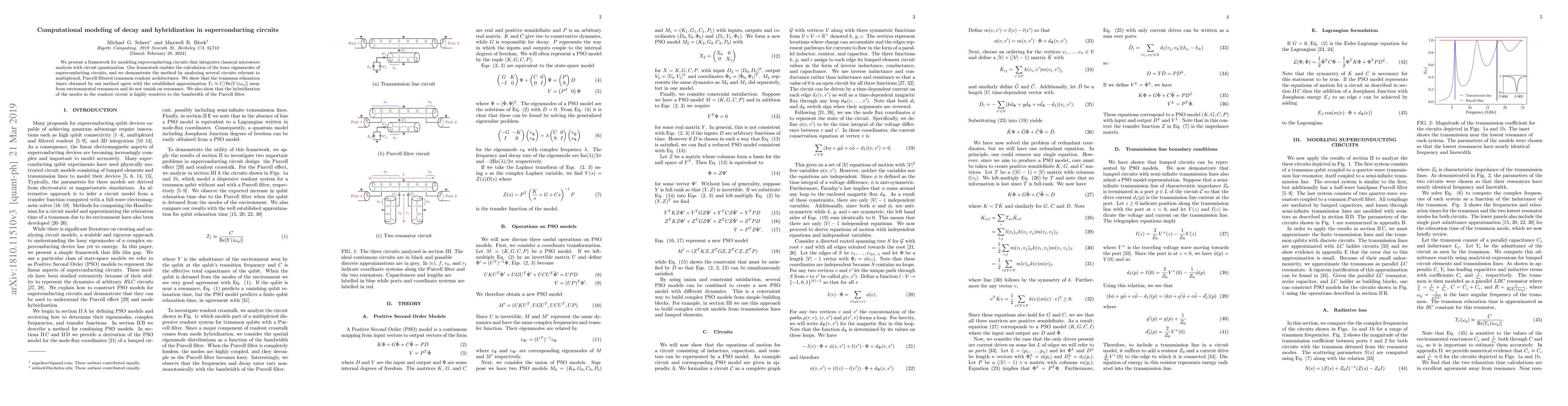 We present a framework for modeling superconducting circuits that integrates classical microwave analysis with circuit quantization. Our framework enables the calculation of the lossy eigenmodes of superconducting circuits, and we demonstrate the method by analyzing several circuits relevant to multiplexed, Purcell filtered transmon readout architectures. We show that the transmon relaxation times obtained by our method agree with the established approximation $T_1 \approx C/\text{Re}[Y(i\omega_q)]$ away from environmental resonances and do not vanish on resonance. We also show that the hybridization of the modes in the readout circuit is highly sensitive to the bandwidth of the Purcell filter.