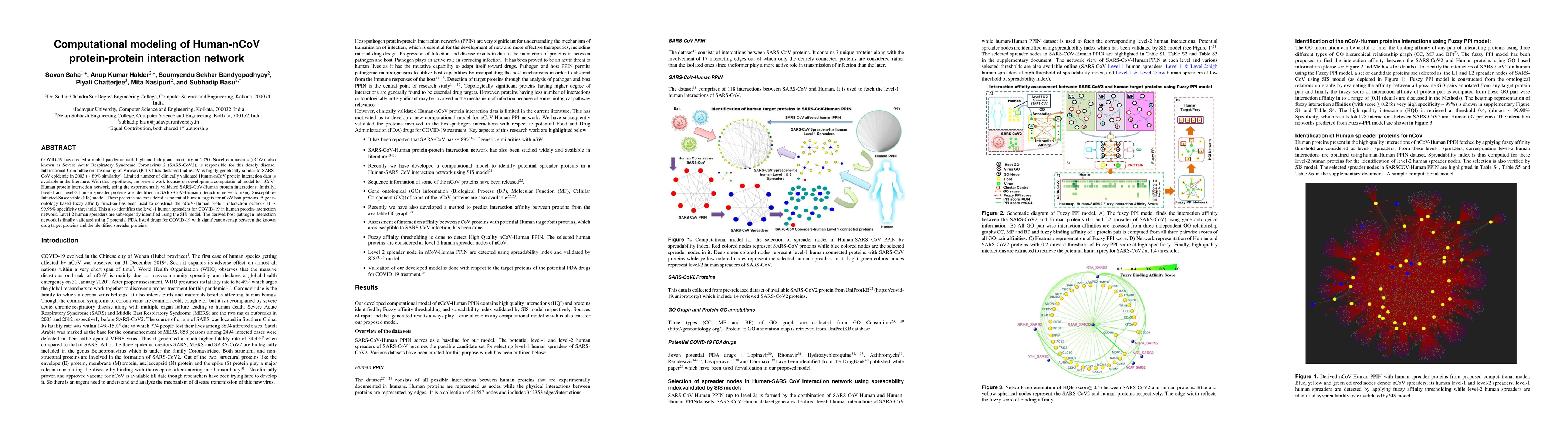 COVID-19 has created a global pandemic with high morbidity and mortality in 2020. Novel coronavirus (nCoV), also known as Severe Acute Respiratory Syndrome Coronavirus 2 (SARS-CoV2), is responsible for this deadly disease. International Committee on Taxonomy of Viruses (ICTV) has declared that nCoV is highly genetically similar to SARS-CoV epidemic in 2003 (89% similarity). Limited number of clinically validated Human-nCoV protein interaction data is available in the literature. With this hypothesis, the present work focuses on developing a computational model for nCoV-Human protein interaction network, using the experimentally validated SARS-CoV-Human protein interactions. Initially, level-1 and level-2 human spreader proteins are identified in SARS-CoV-Human interaction network, using Susceptible-Infected-Susceptible (SIS) model. These proteins are considered as potential human targets for nCoV bait proteins. A gene-ontology based fuzzy affinity function has been used to construct the nCoV-Human protein interaction network at 99.98% specificity threshold. This also identifies the level-1 human spreaders for COVID-19 in human protein-interaction network. Level-2 human spreaders are subsequently identified using the SIS model. The derived host-pathogen interaction network is finally validated using 7 potential FDA listed drugs for COVID-19 with significant overlap between the known drug target proteins and the identified spreader proteins.