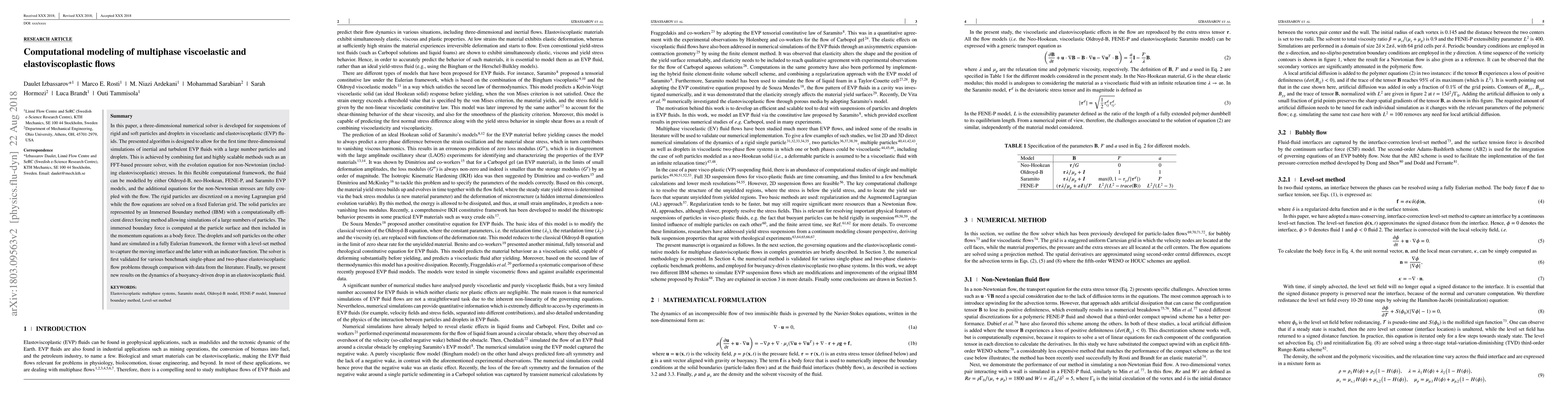 In this paper, a three-dimensional numerical solver is developed for suspensions of rigid and soft particles and droplets in viscoelastic and elastoviscoplastic (EVP) fluids. The presented algorithm is designed to allow for the first time three-dimensional simulations of inertial and turbulent EVP fluids with a large number particles and droplets. This is achieved by combining fast and highly scalable methods such as an FFT-based pressure solver, with the evolution equation for non-Newtonian (including elastoviscoplastic) stresses. In this flexible computational framework, the fluid can be modelled by either Oldroyd-B, neo-Hookean, FENE-P, and Saramito EVP models, and the additional equations for the non-Newtonian stresses are fully coupled with the flow. The rigid particles are discretized on a moving Lagrangian grid while the flow equations are solved on a fixed Eulerian grid. The solid particles are represented by an Immersed Boundary method (IBM) with a computationally efficient direct forcing method allowing simulations of a large numbers of particles. The immersed boundary force is computed at the particle surface and then included in the momentum equations as a body force. The droplets and soft particles on the other hand are simulated in a fully Eulerian framework, the former with a level-set method to capture the moving interface and the latter with an indicator function. The solver is first validated for various benchmark single-phase and two-phase elastoviscoplastic flow problems through comparison with data from the literature. Finally, we present new results on the dynamics of a buoyancy-driven drop in an elastoviscoplastic fluid.