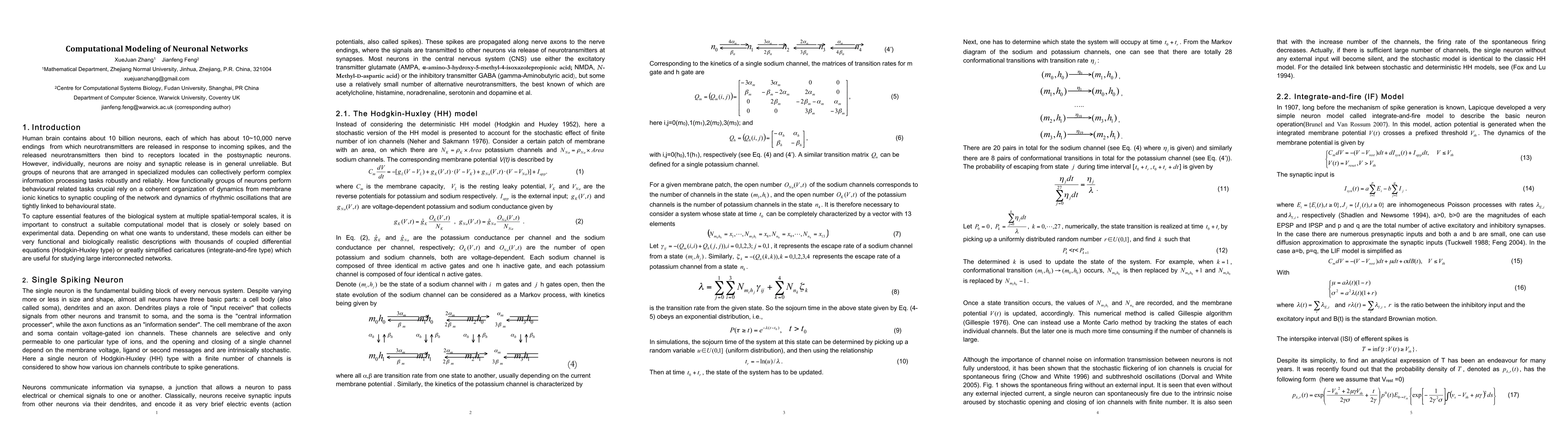 Human brain contains about 10 billion neurons, each of which has about 10~10,000 nerve endings from which neurotransmitters are released in response to incoming spikes, and the released neurotransmitters then bind to receptors located in the postsynaptic neurons. However, individually, neurons are noisy and synaptic release is in general unreliable. But groups of neurons that are arranged in specialized modules can collectively perform complex information processing tasks robustly and reliably. How functionally groups of neurons perform behavioural related tasks crucial rely on a coherent organization of dynamics from membrane ionic kinetics to synaptic coupling of the network and dynamics of rhythmic oscillations that are tightly linked to behavioural state. To capture essential features of the biological system at multiple spatial-temporal scales, it is important to construct a suitable computational model that is closely or solely based on experimental data. Depending on what one wants to understand, these models can either be very functional and biologically realistic descriptions with thousands of coupled differential equations (Hodgkin-Huxley type) or greatly simplified caricatures (integrate-and-fire type) which are useful for studying large interconnected networks.
