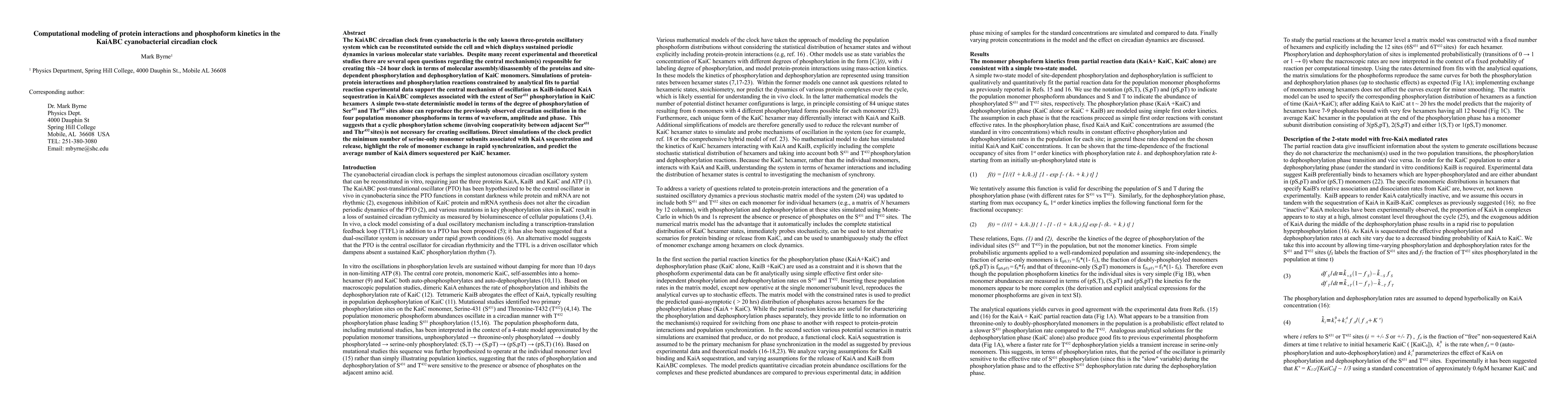 This paper uses computational modeling to investigate the mechanisms behind the KaiABC cyanobacterial circadian clock, focusing on protein interactions and phosphorylation kinetics. The study finds that KaiB-induced KaiA sequestration and the degree of Ser431 phosphorylation in KaiC hexamers are central to the clock's oscillation, suggesting that a simple two-state model suffices for circadian rhythm without requiring complex phosphorylation schemes.