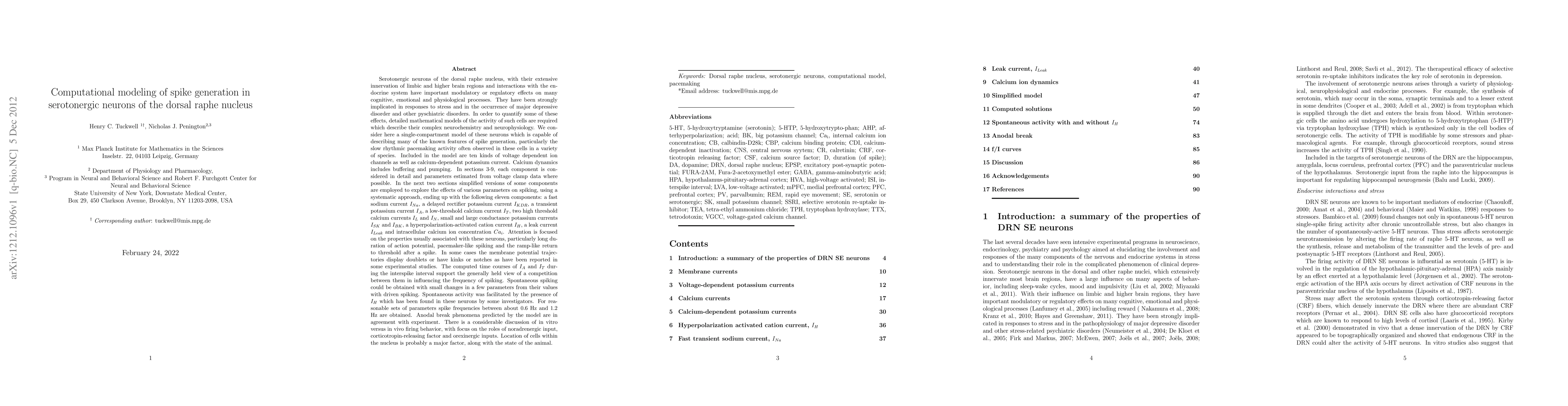 This paper presents a single-compartment computational model of serotonergic neurons in the dorsal raphe nucleus, incorporating ten voltage-dependent ion channels and calcium dynamics to simulate their slow rhythmic spike generation. The model's parameters are estimated from voltage clamp data, and it successfully replicates key features such as long action potentials and pacemaker-like activity.