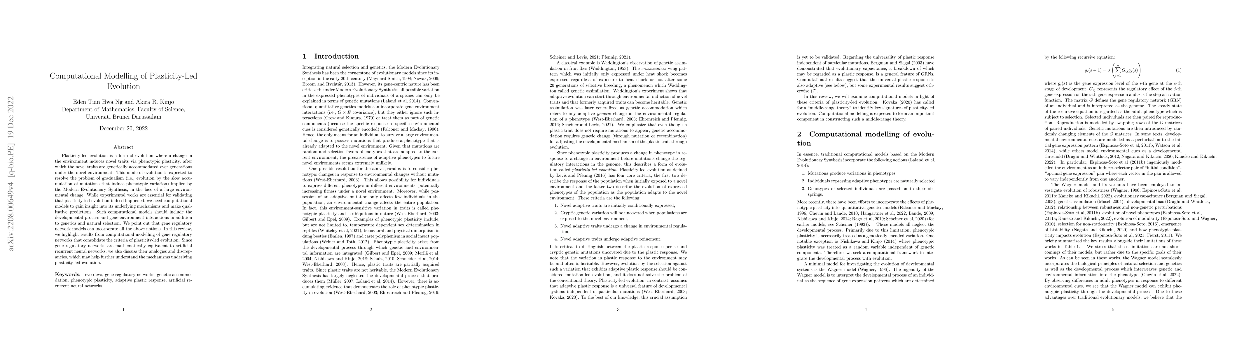 Plasticity-led evolution is a form of evolution where a change in the environment induces novel traits via phenotypic plasticity, after which the novel traits are genetically accommodated over generations under the novel environment. This mode of evolution is expected to resolve the problem of gradualism (i.e., evolution by the slow accumulation of mutations that induce phenotypic variation) implied by the Modern Evolutionary Synthesis, in the face of a large environmental change. While experimental works are essential for validating that plasticity-led evolution indeed happened, we need computational models to gain insight into its underlying mechanisms and make qualitative predictions. Such computational models should include the developmental process and gene-environment interactions in addition to genetics and natural selection. We point out that gene regulatory network models can incorporate all the above notions. In this review, we highlight results from computational modelling of gene regulatory networks that consolidate the criteria of plasticity-led evolution. Since gene regulatory networks are mathematically equivalent to artificial recurrent neural networks, we also discuss their analogies and discrepancies, which may help further understand the mechanisms underlying plasticity-led evolution.