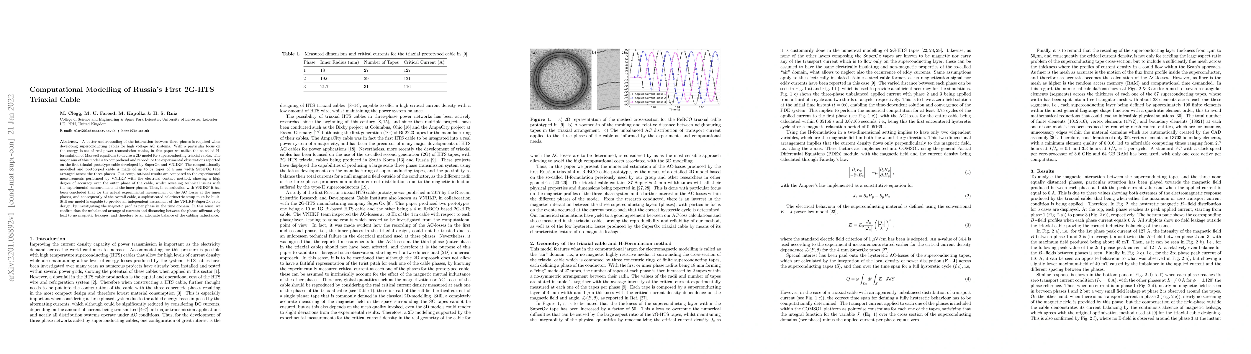 This paper develops a 2D computational model using the H-formulation of Maxwell equations to analyze Russia's first 2G-HTS triaxial cable, comparing results with experimental data and identifying technical issues in inner phase measurements. The model confirms the design's effectiveness in balancing cabling inductance.