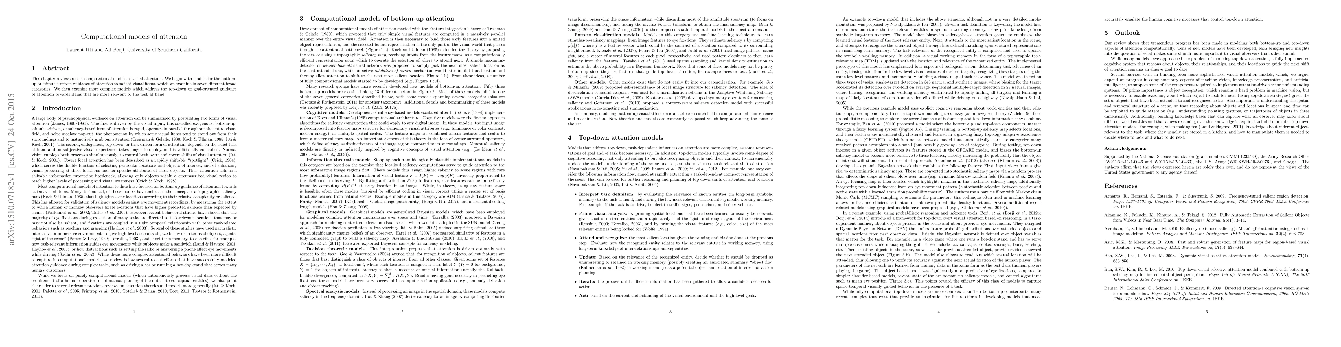 This chapter reviews recent computational models of visual attention. We begin with models for the bottom-up or stimulus-driven guidance of attention to salient visual items, which we examine in seven different broad categories. We then examine more complex models which address the top-down or goal-oriented guidance of attention towards items that are more relevant to the task at hand.